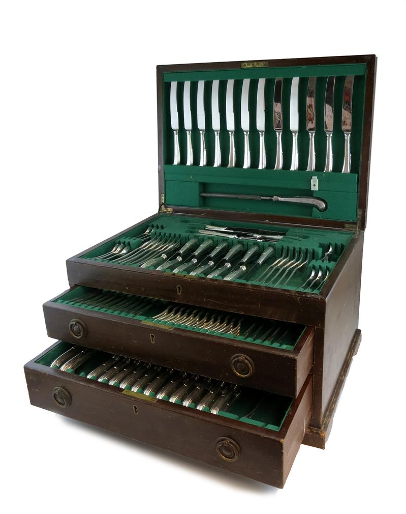 comprising: eleven table forks, twelve dessert forks, twelve dessert spoons, eleven soup spoons, ten teaspoons, five egg spoons, twelve table knives, twelve dessert knives, pistol-grip handles, twelve fish knives, twelve fish forks, a pair of fish servers, a sauce ladle, and a five-piece carving set, in a fitted wooden case.