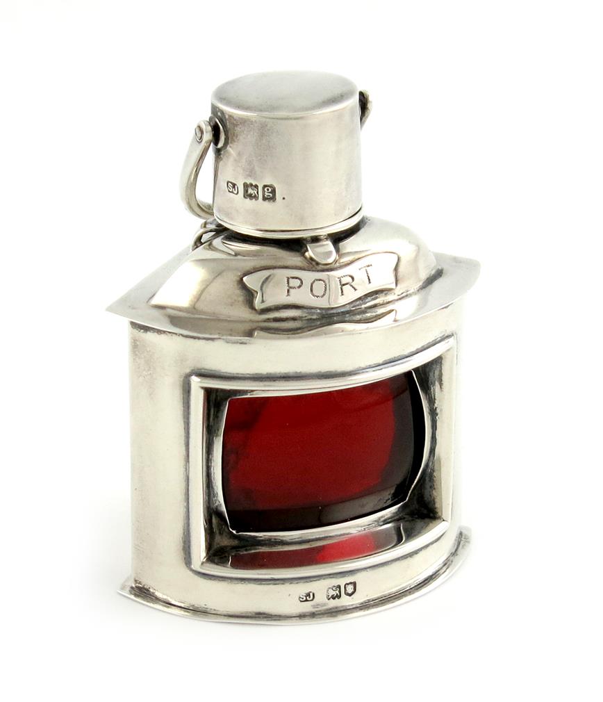 triangular segment form, with a red panel under glass, the hinged cover opens to reveal the wick holder, hinged carrying handle, height 8.2cm, approx. weight 4.1oz.