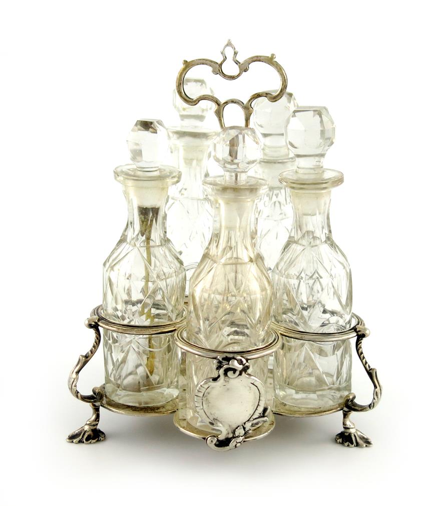 cinquefoil form, central pierced handle, wire-work frame, with a scroll cartouche, on four shell pad feet, with five cut-glass sauce bottles, one with a spoon, height 17.5cm, approx. weight 6.8oz.
