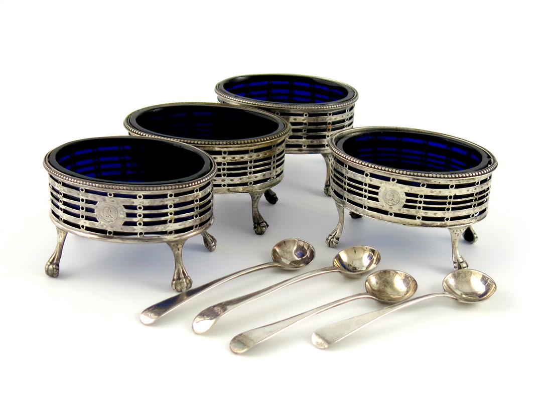 oval form, pierced decoration, beaded borders, on four claw and ball feet, with blue glass liners, engraved with a crest, plus four various salt spoons, approx. weight 6.8oz. (8)