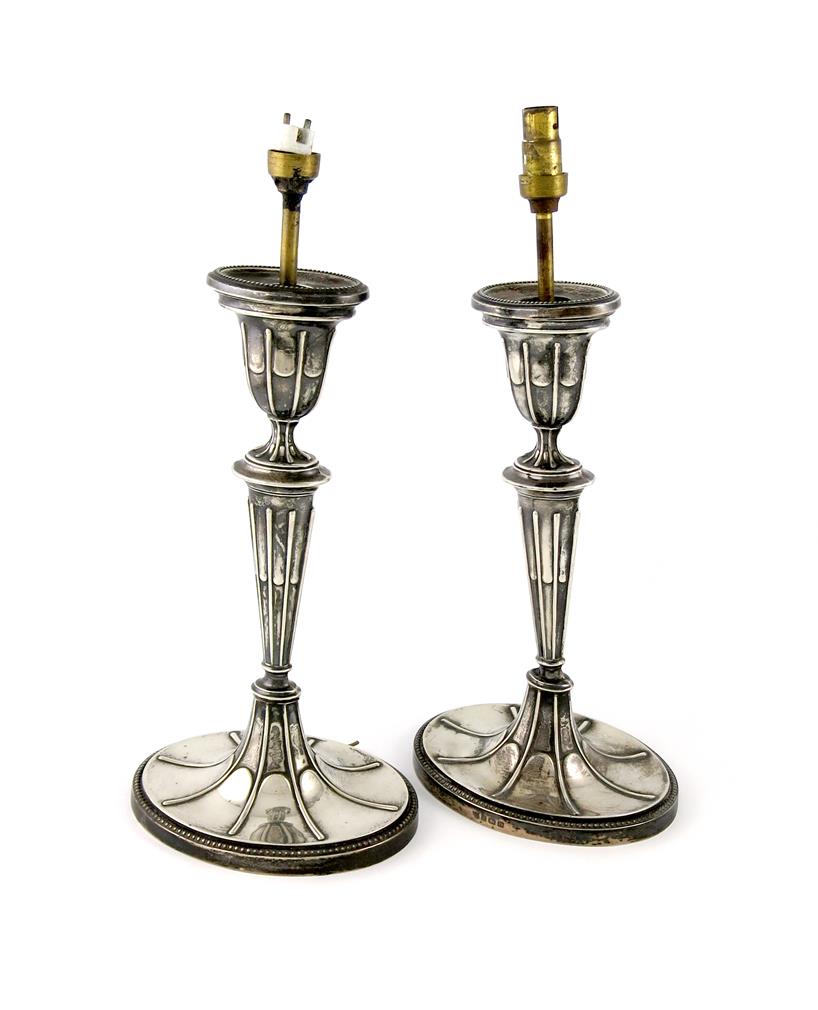 tapering oval form, ribbed decoration, on raised oval bases with beaded borders, height 28.5cm. (2)