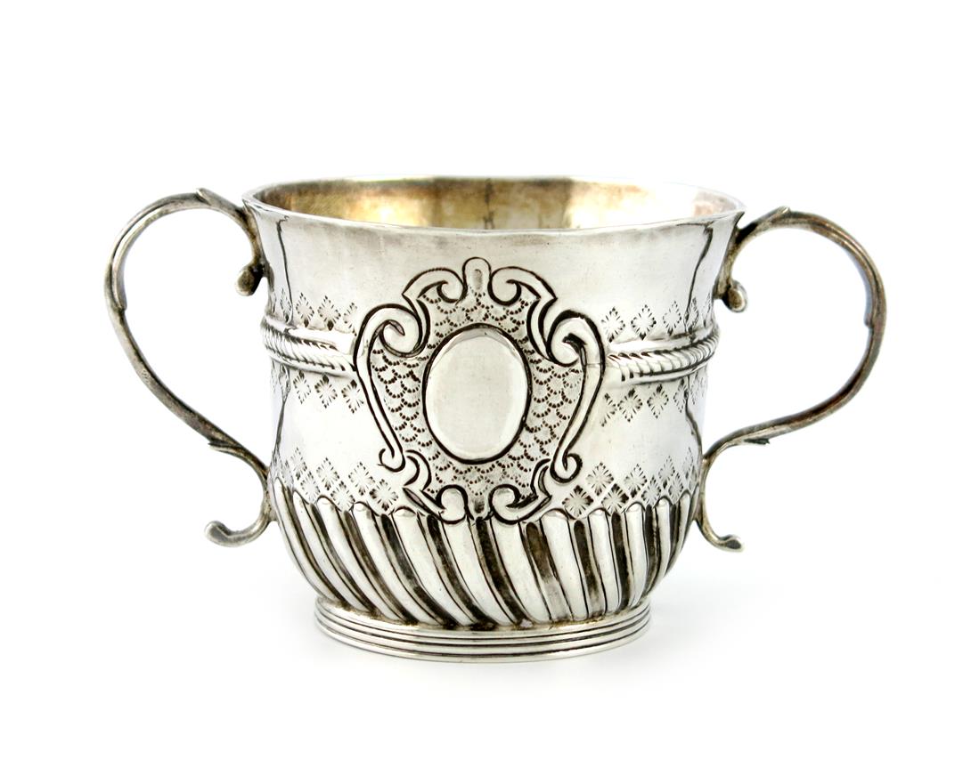 circular form, scroll handles, punched decoration, central rope-work girdle, above part-fluted decoration, with an oval cartouche, height 7.8cm, approx. weight 4.9oz.