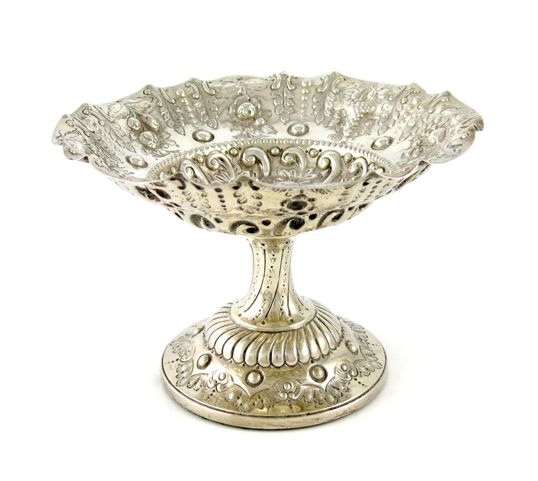 circular form, embossed with fruit and foliate scroll decoration, on a raised part-fluted base, height 20cm.