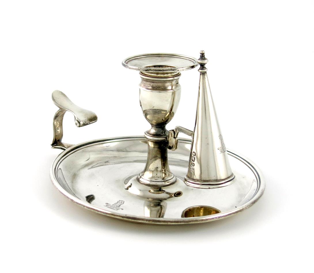 circular form, scroll handle, with a plain thumb-piece, urn shaped capital, plus a later conical snuffer, diameter of base 14.8cm, approx. weight 10oz.