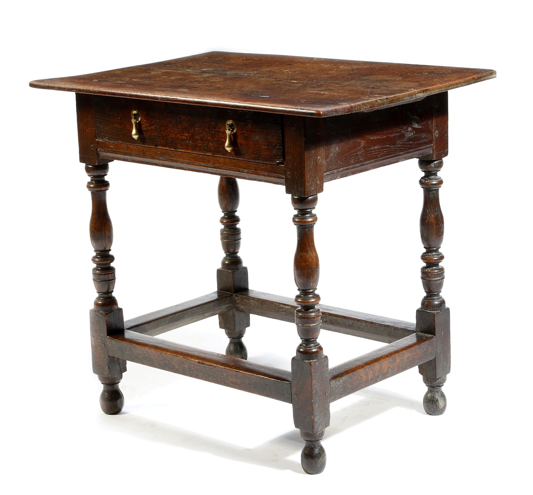 A Queen Anne oak side table, the twin plank top above a frieze drawer, on baluster ring and cover turned legs, united by peripheral stretchers, 71.8cm high, 77cm wide, 54.5cm deep.