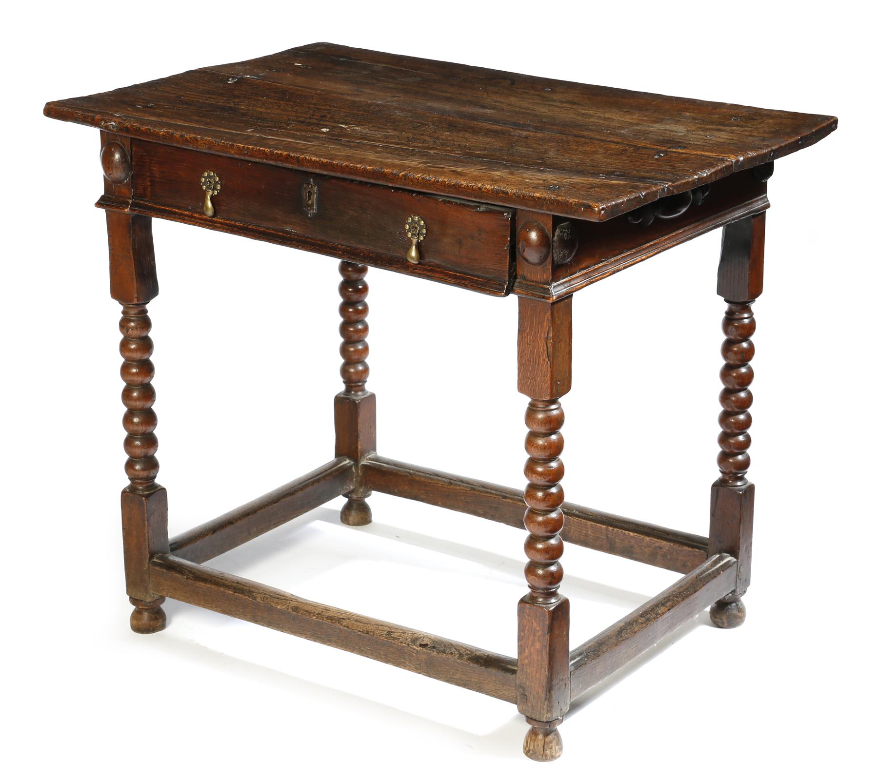 A William & Mary oak side table, the boarded top above a frieze drawer, the sides and corners with split baton and rondel mouldings, on block and bobbin legs united by peripheral stretchers, 72.3cm high, 85cm wide, 55cm deep.
