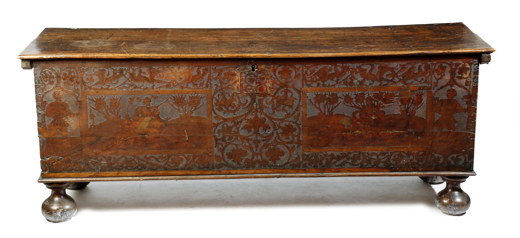 A late 17th century Italian cedarwood Adige chest, the hinged top penwork decorated to the underside, with scrolling leaves and flowers, with a pair of panels with a lion and a leopard flanking a cartouche, the front decorated with poker and penwork with birds, figures and scrolling leaves and flowers, on bun feet, 70cm high, 185cm wide, 56.8cm deep.