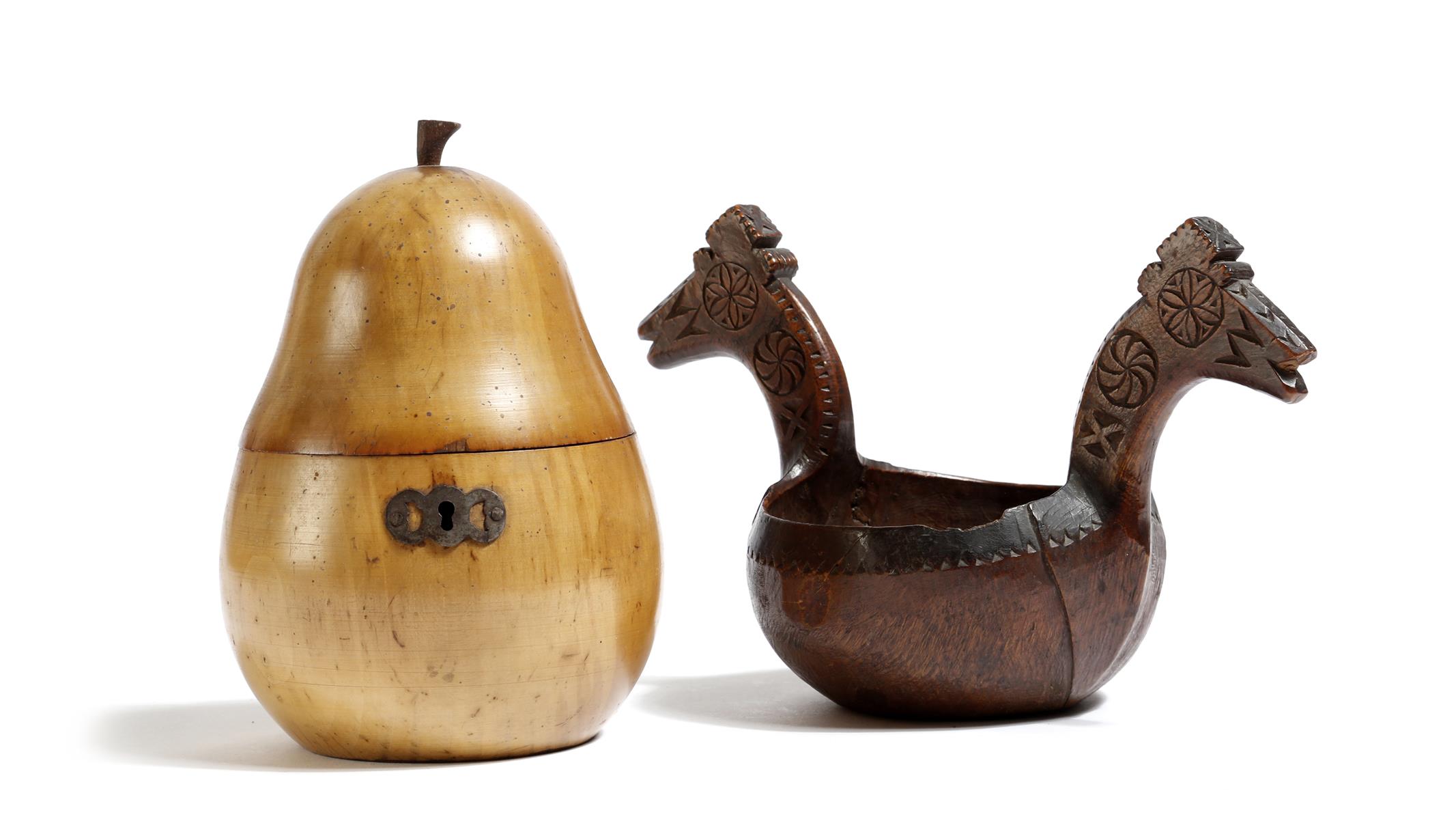 A Norwegian wood kasa, with chip carved decoration and with horse's head handles, the base dated '1808' and with a monogram, 13cm high, together with a French fruitwood tea caddy in the form of a pear, 15.3cm high. (2)