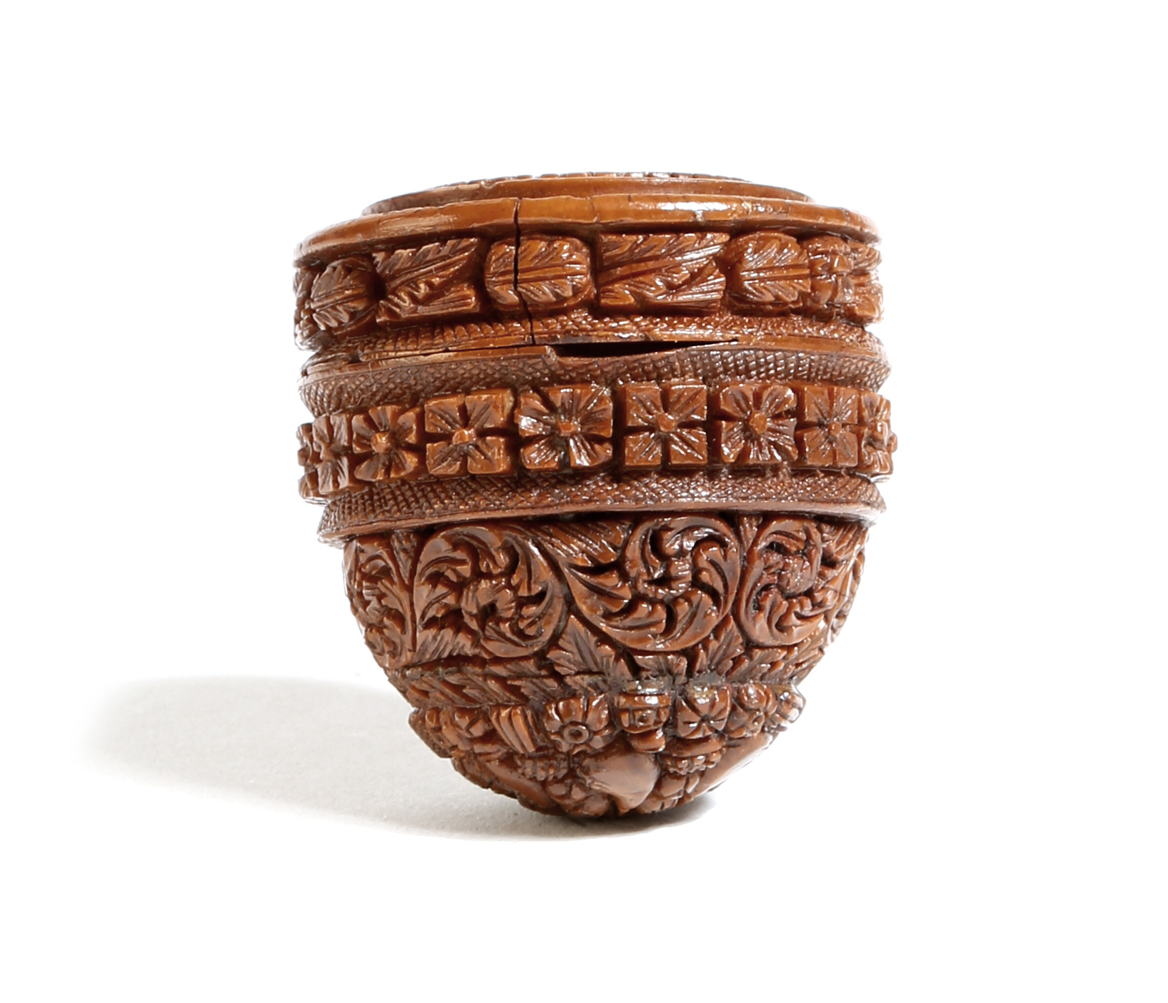 A 19th century carved coquilla nut pomander, with a screw off lid, pierced and carved with scrolling leaves, above a band of flowers, the pierced base finely carved with leaves and fruit, 4.3cm high.