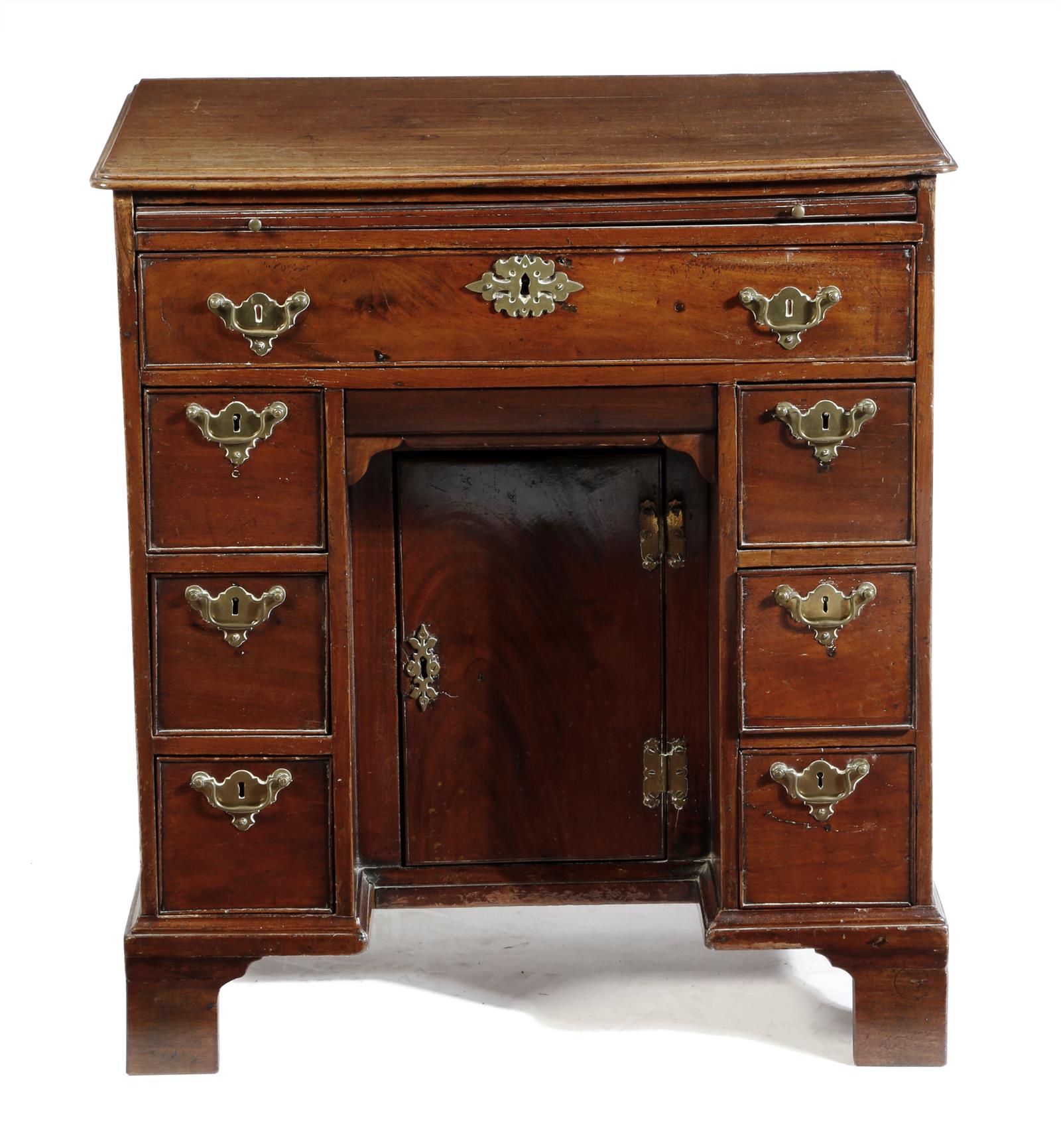 An early George III mahogany kneehole desk, fitted with a plush lined brushing slide, above an arrangement of eight drawers, around a central cupboard, on later bracket feet, 80cm high, 73.2cm wide, 47cm deep.