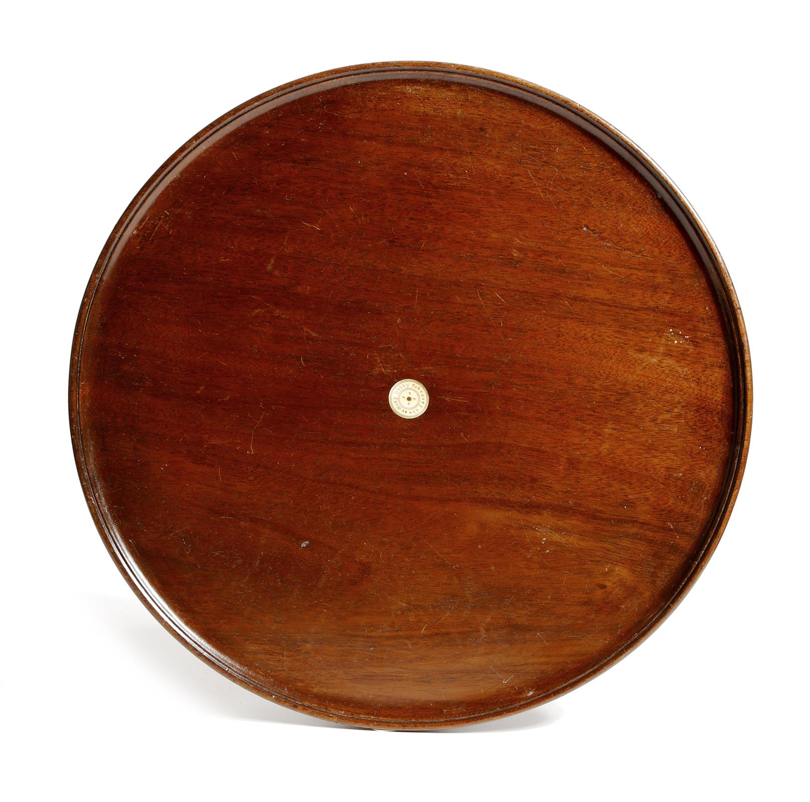 λ A George III mahogany circular dished tray, the centre with an ivory circular plaque inscribed 'Mary Dolby February the 14th 1766', 47cm diameter.