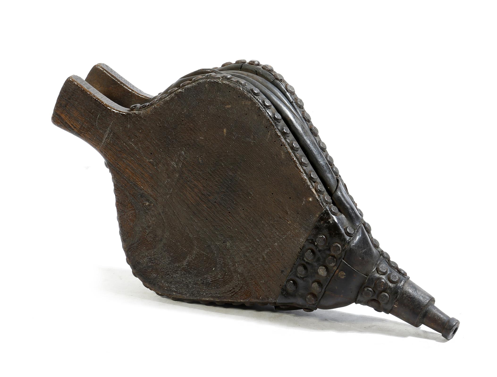 A pair of elm and studded leather fire bellows, 48.8cm long.