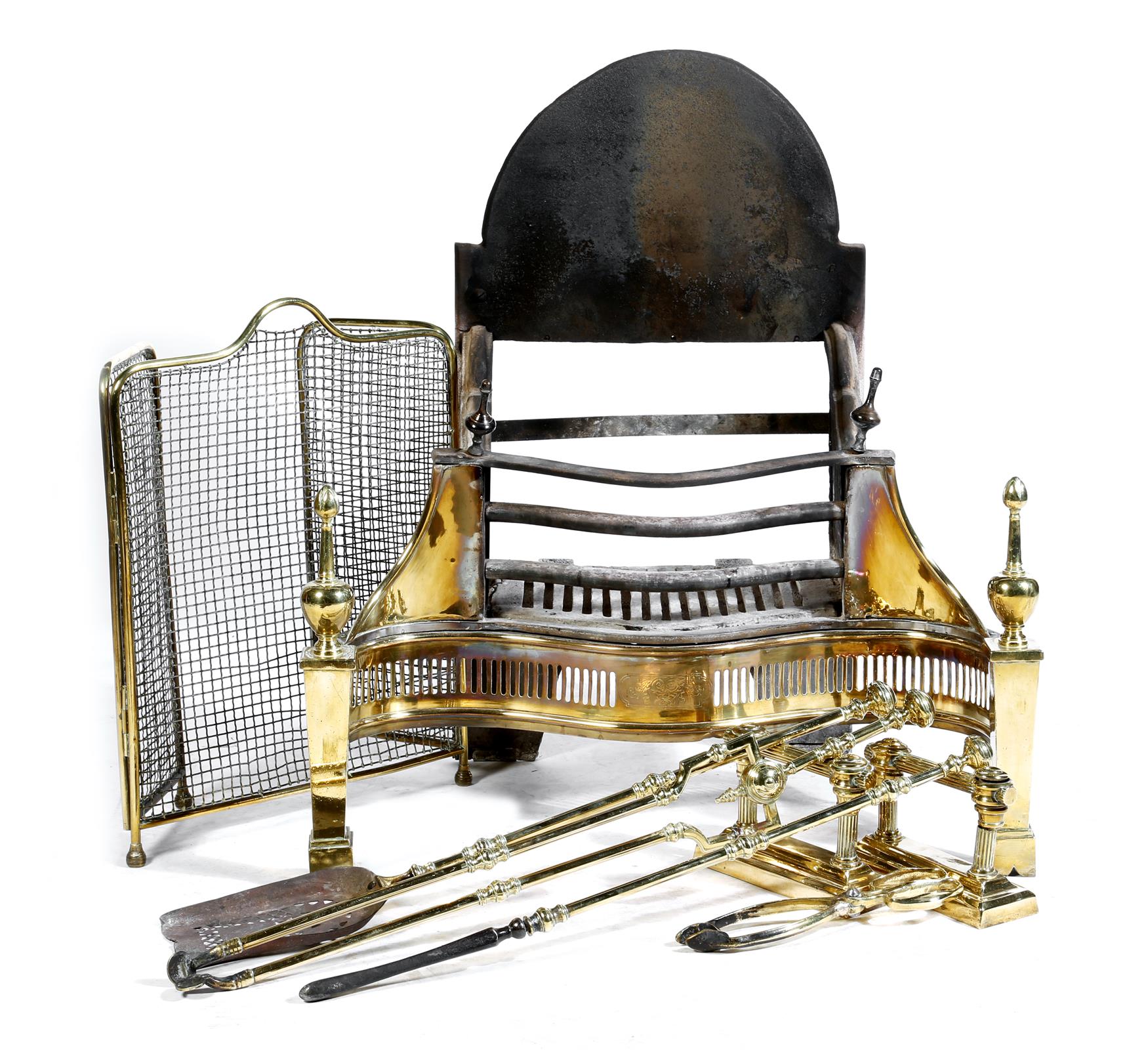 A brass serpentine fire-grate in George III style, with an arched cast iron back, above a railed front, with urn finials and a pierced apron, 79.8cm high, 72.5cm wide, 44.5cm deep, together with a triptych brass and mesh folding spark guard, a set of three brass fire tools and a pair of brass tool rests. (7)