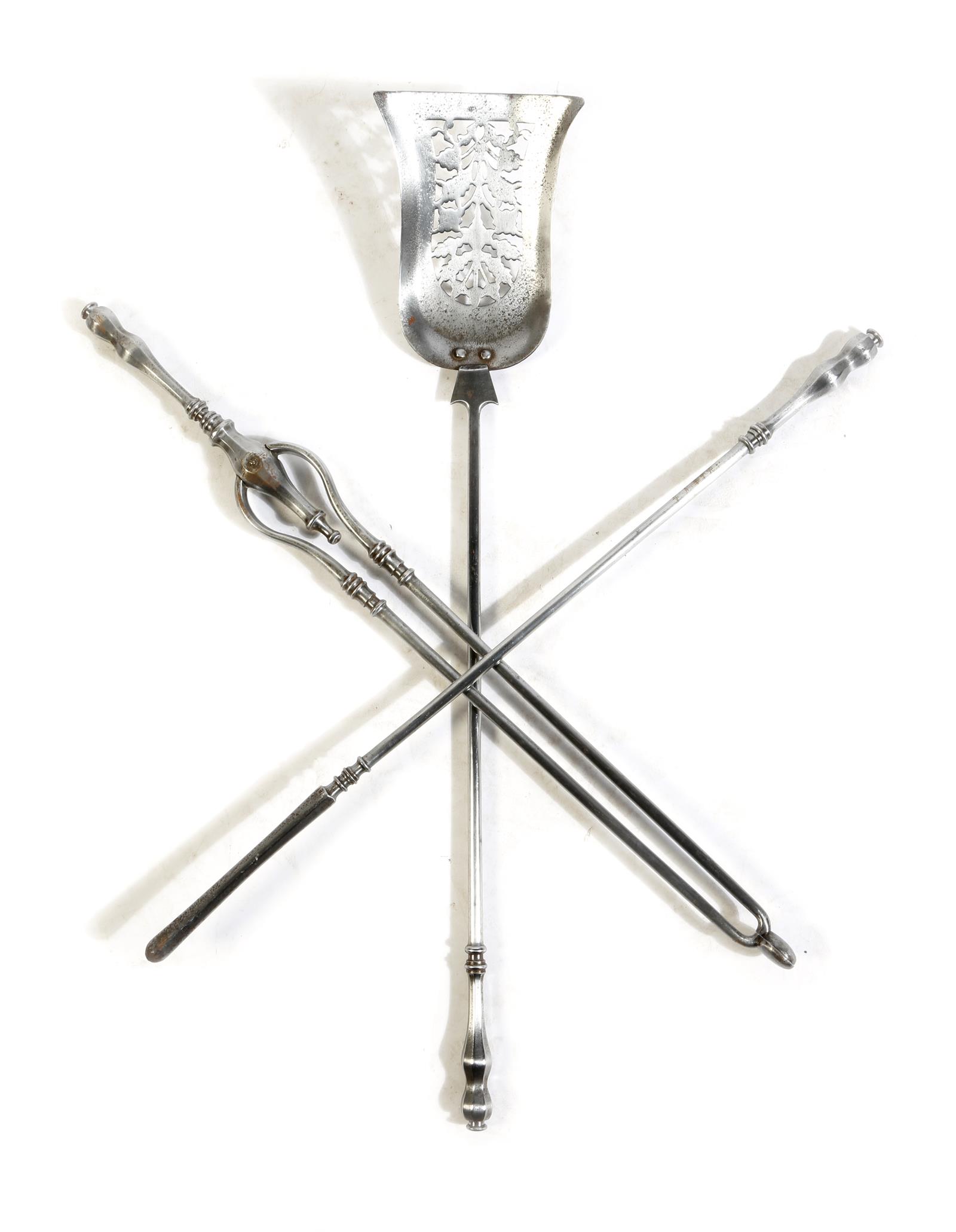 A set of three early 19th century steel fire tools, each with a faceted handle and knopped stem, with a pierced pan, 77cm long. (3)