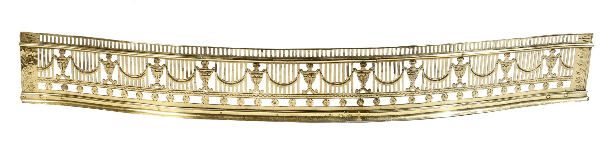 A George III cast brass serpentine fender, with urns and swags and foliate engraved decoration, 13.8cm high, 109.5cm wide.