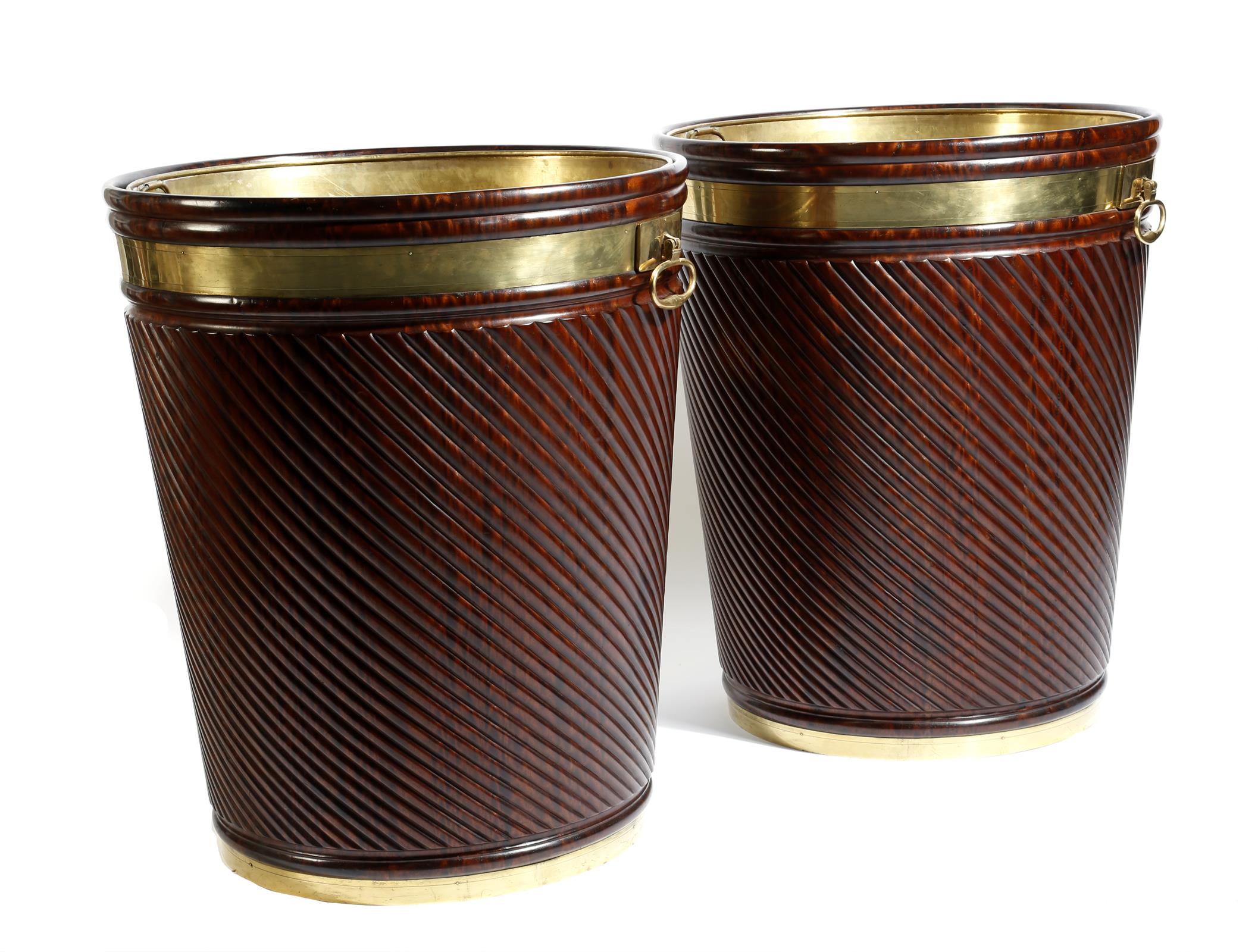 A massive pair of Regency Irish style mahogany and brass mounted peat buckets, each with a removable liner, with a pair of carrying handles and spiral ribbed tapering bodies, of recent manufacture, 91.5cm high, 78cm diameter. (2)