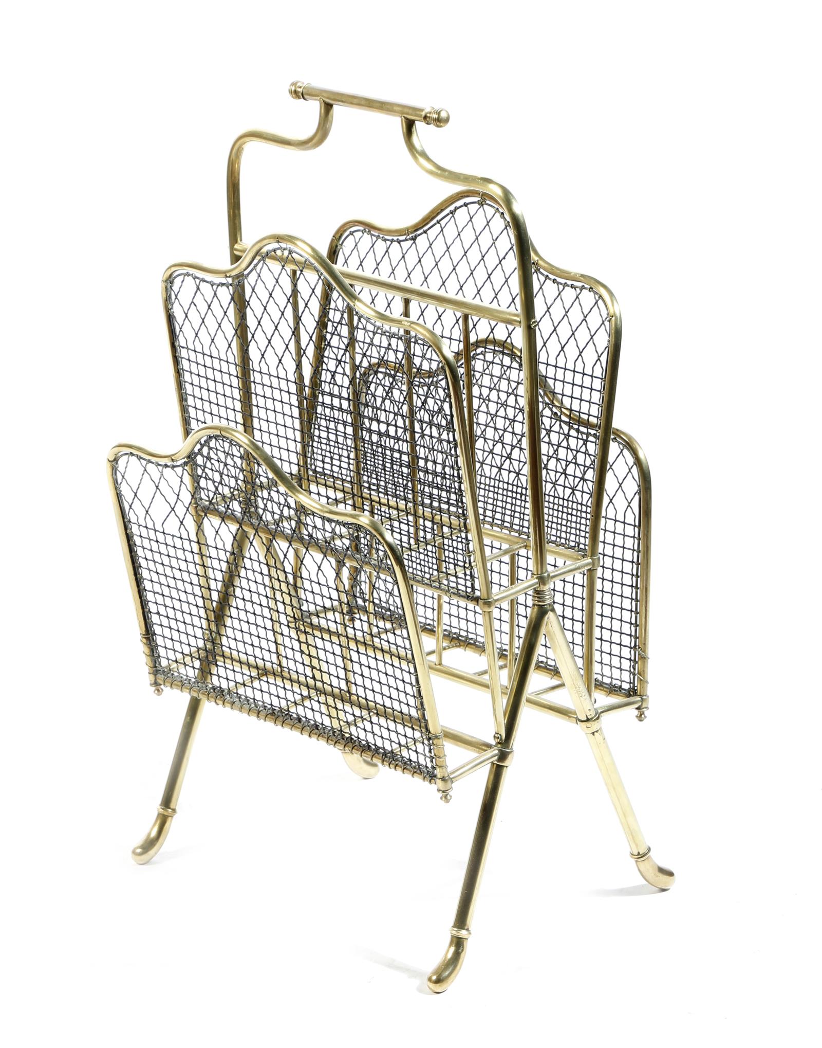 A late Victorian brass and wirework magazine rack, with four divisions, stamped 'S. H. & S.' with registration number 'RD NO 80693', 72.4cm high, 40.5cm wide, 30cm deep.