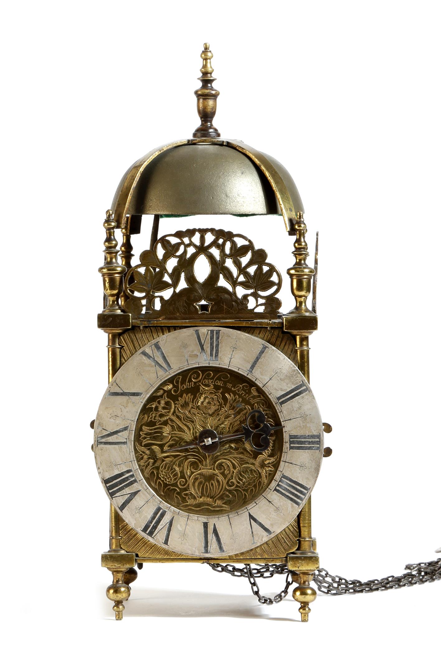 A William and Mary brass lantern clock by John London of Bristol, the posted movement, with an outside countwheel and striking on a bell, with a later recoil anchor escapement, the dial with a silvered chapter ring with Roman numerals, the centre engraved with an urn of flowers and signed 'John London m Bristoll', with radiating designs to the spandrels, the case with one piece finial, post and feet, with pierced frets and a turned urn finial, the movement holes have keyhole style piercings which is a John London feature, 39cm high.