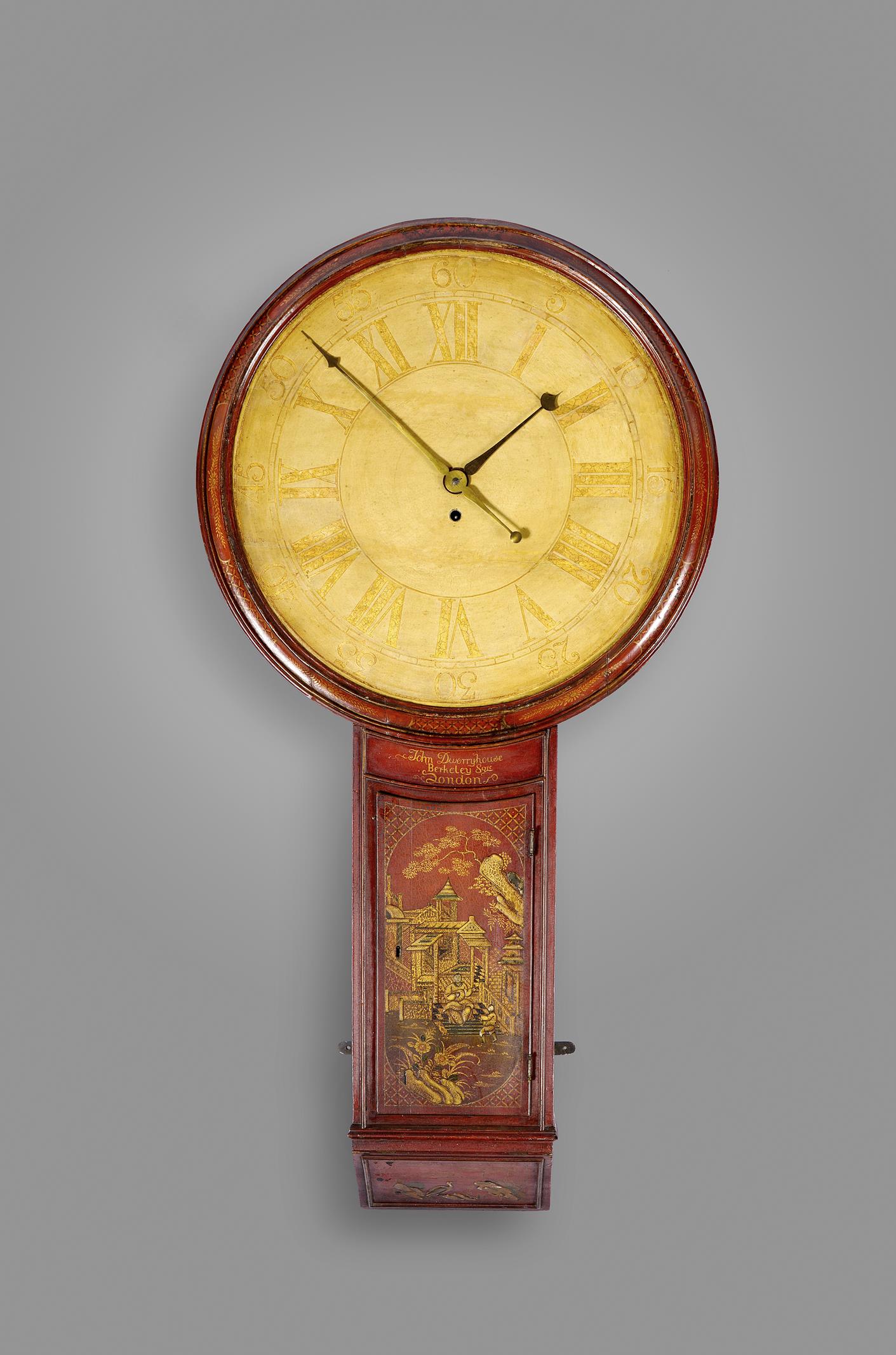 A George III red japanned tavern timepiece, the brass movement with recoil anchor escapement, five turned pillars and with tapered plates, the 25 1/4in repainted circular dial with Roman and Arabic numerals and brass hands, the case signed 'John Dwerryhouse Berkeley Sqre London', the door decorated with chinoiserie with figures before buildings, above a hinged door base decorated with birds, 148cm high.