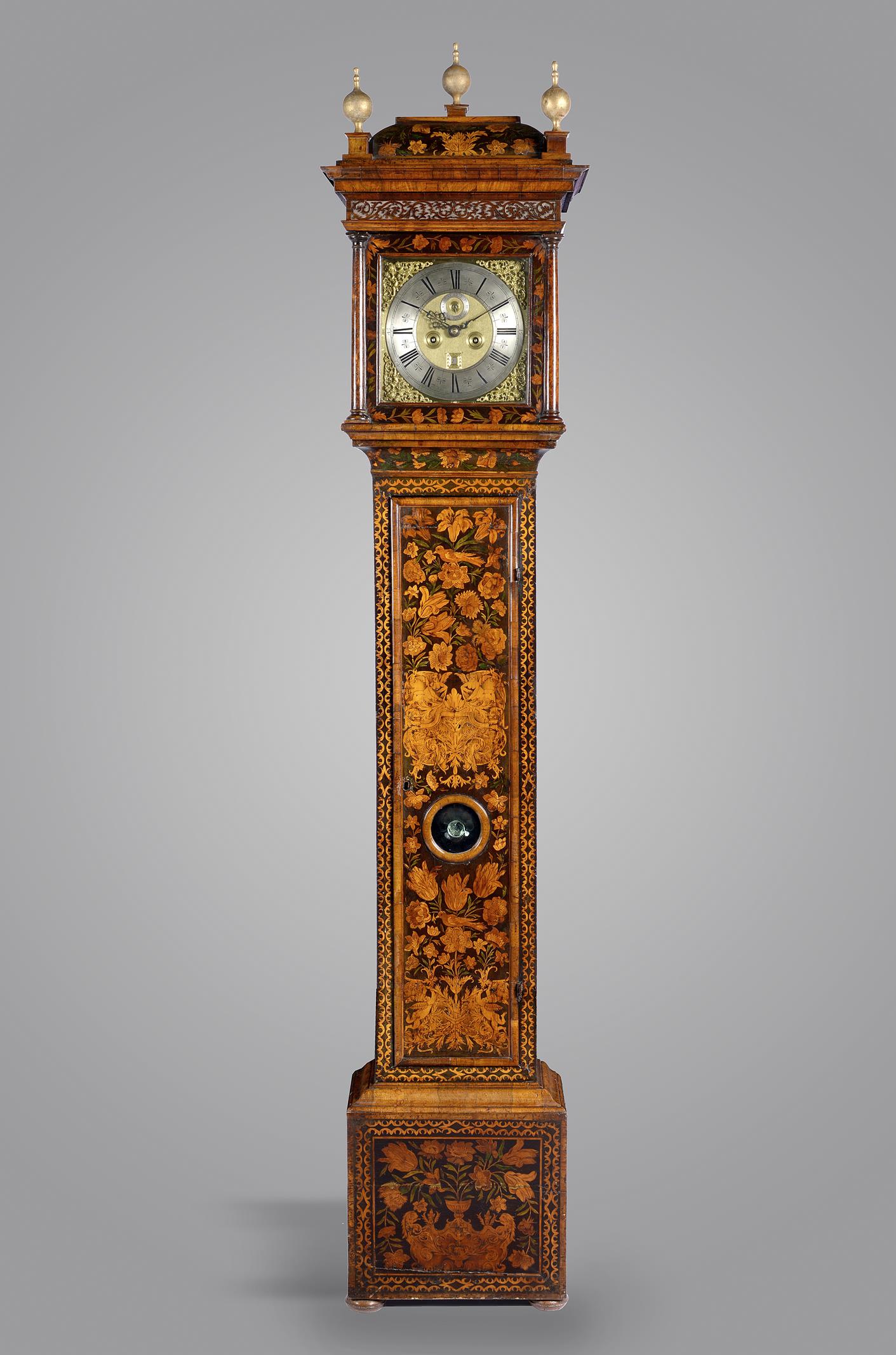 A William & Mary walnut and marquetry longcase clock by Thomas Johnson, the brass eight day movement with four turned and finned pillars, with recoil anchor escapement and internal countwheeel with strike to bell, the 11in dial with gilt cast boys and crown spandrels, with a silvered chapter ring with Roman and Arabic numerals, the matted centre with a subsidiary seconds dial and engraved date aperture, with ringed winding holes, signed 'Thos Johnson London' to the lower edge of the dial, the case with a caddy top inlaid with flowers with three giltwood ball finials, above a fret carved frieze and columns, above floral and leafage borders, the trunk door inlaid with birds, flowers and naked winged figures with a glass lenticle, with a conforming plinth and flattened disc feet, 238cm high.