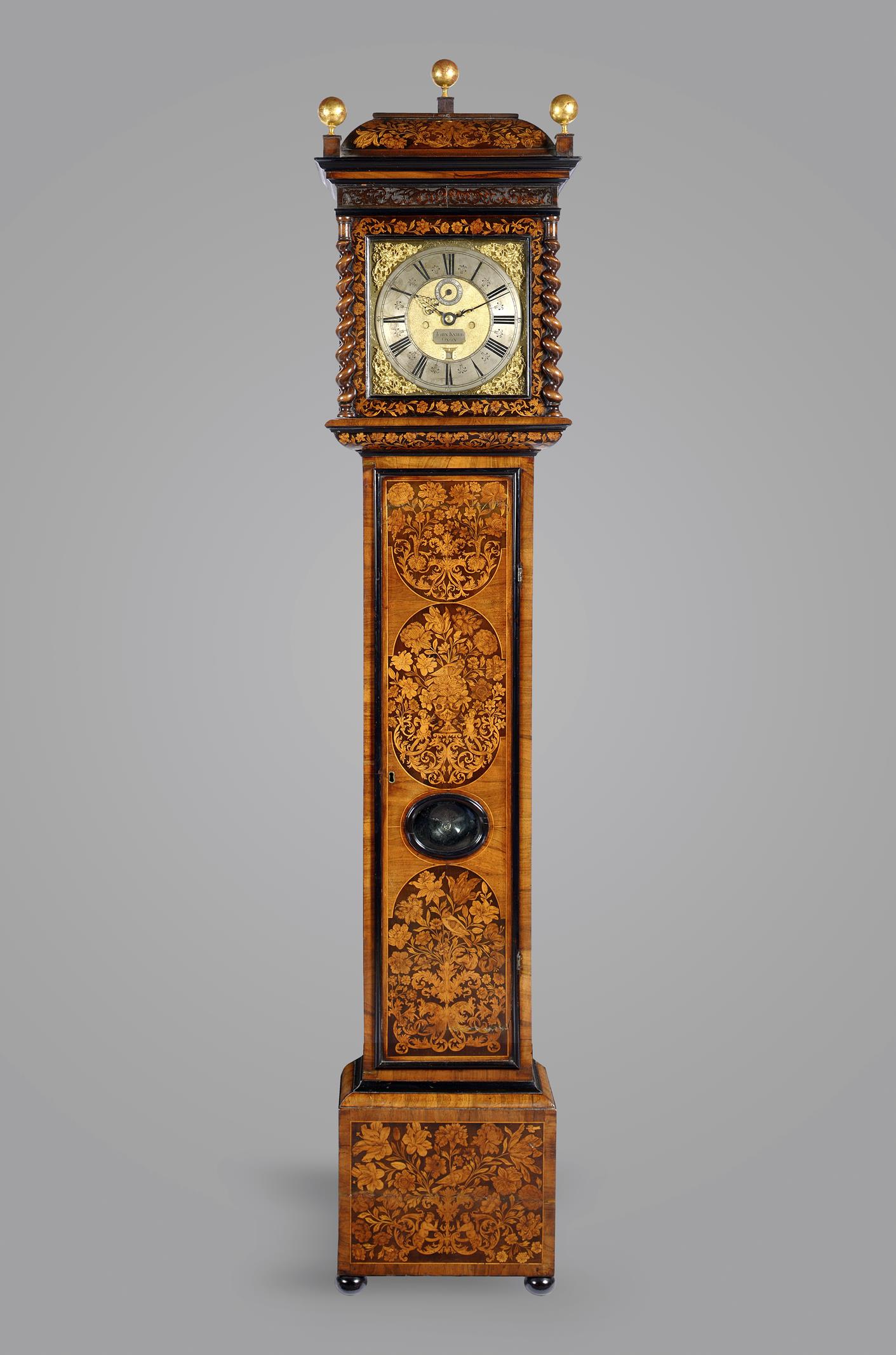 A William and Mary walnut and marquetry longcase clock by John Knibb of Oxford, the brass eight day movement of light construction with seven ring turned and knopped pillars and recoil anchor escapement, with fine winged nut regulation suspension above the back cock, with bolt and shutter maintaining power, the outside countwheel striking on a bell, the 11in latched dial with gilt cast cherub mask spandrels, with a silvered chapter ring with Roman numerals, the matted centre with engraved calendar aperture and subsidiary seconds dial and applied with a shaped signature plaque inscribed 'JOHN KNIBB OXON', the case with a domed caddy top inlaid with flowers and shells, with giltwood ball finials above a fret carved frieze and spiral pilasters to the formerly rising hood, the trunk door inset with a lenticle and decorated with three shaped panels of finely drawn bird, flower and putti marquetry, all on an ebony ground and within a walnut border, the crossbanded plinth with similar decoration, the sides divided into shaped panels by stringing, on bun feet, 210cm high, together with a first edition copy of the 'Knibb Family Clockmakers' by Ronald A. Lee, no.550 of 1,000 printed. (2)