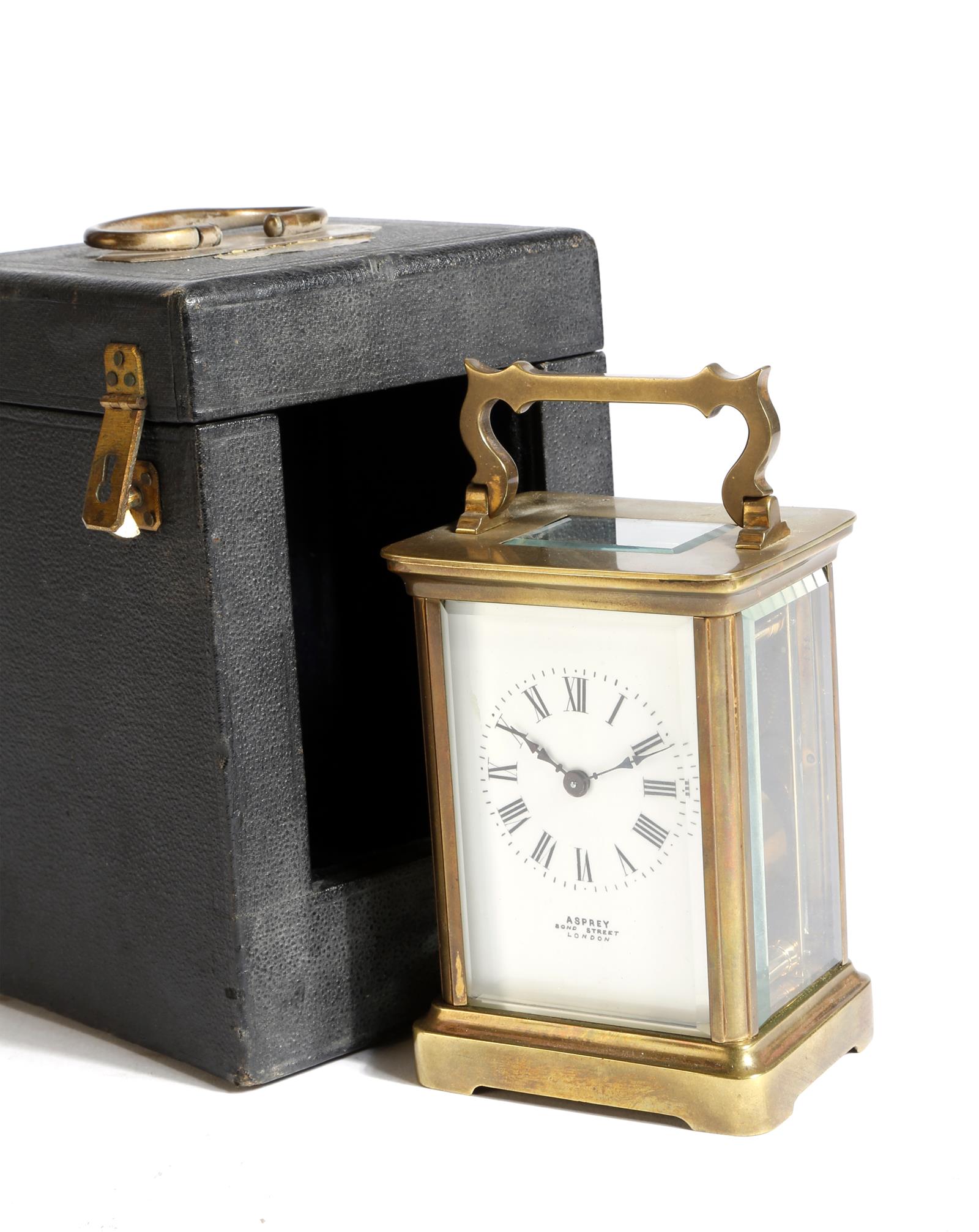 A brass cased carriage timepiece, retailed by Asprey, Bond Street, London,second half 20th century, 11.8cm high, with travelling case. (2)