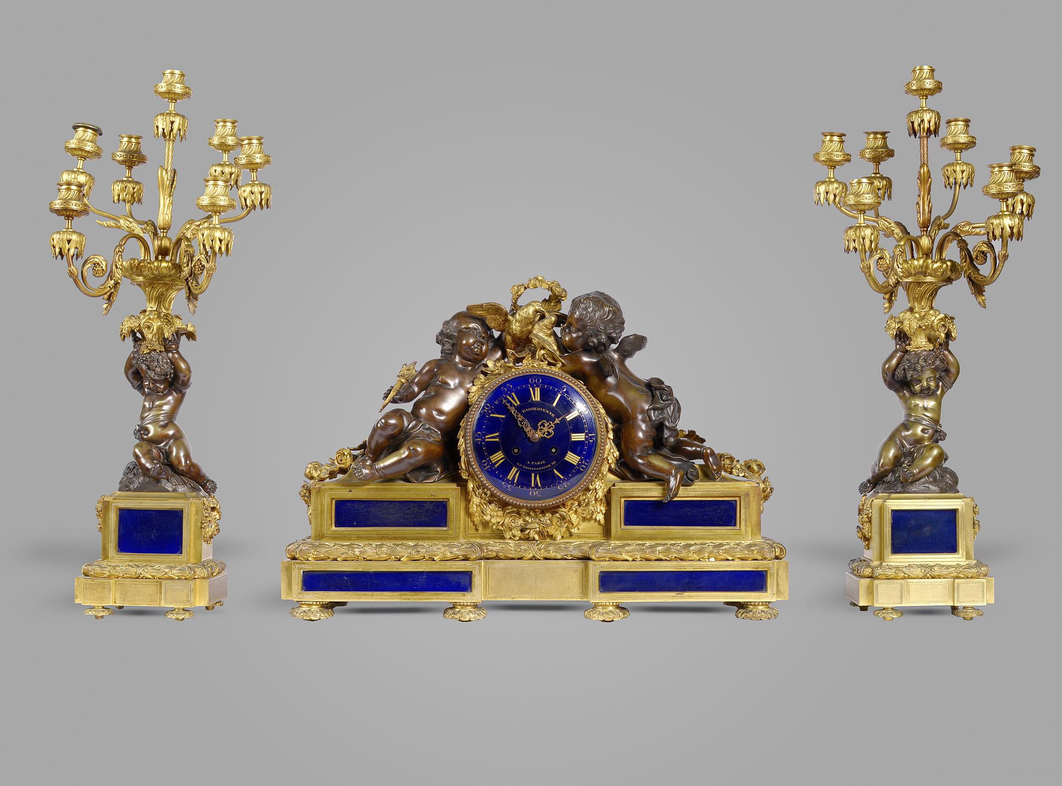 A large Napoleon III gilt and patinated bronze clock garniture by Barbedienne, the brass eight day drum movement by Japy Frères, striking on a bell, stamped with medaille d'or pastille and numbered '925', the circular bleu de roi porcelain dial with Roman and Arabic numerals, with pierced hands and signed 'F. BARBEDIENNE A PARIS, BD POISSONNIERE 30,', the impressive case in Louis XVI style with two cherubs, one holding a torch flanking a pair of love birds with a floral wreath surmount, with further flowers and ribbon tied laurel borders and porcelain mounts, 46.5cm high, 67.2cm, wide, together with a pair of conforming six light candelabra, 74.9cm high. (3)