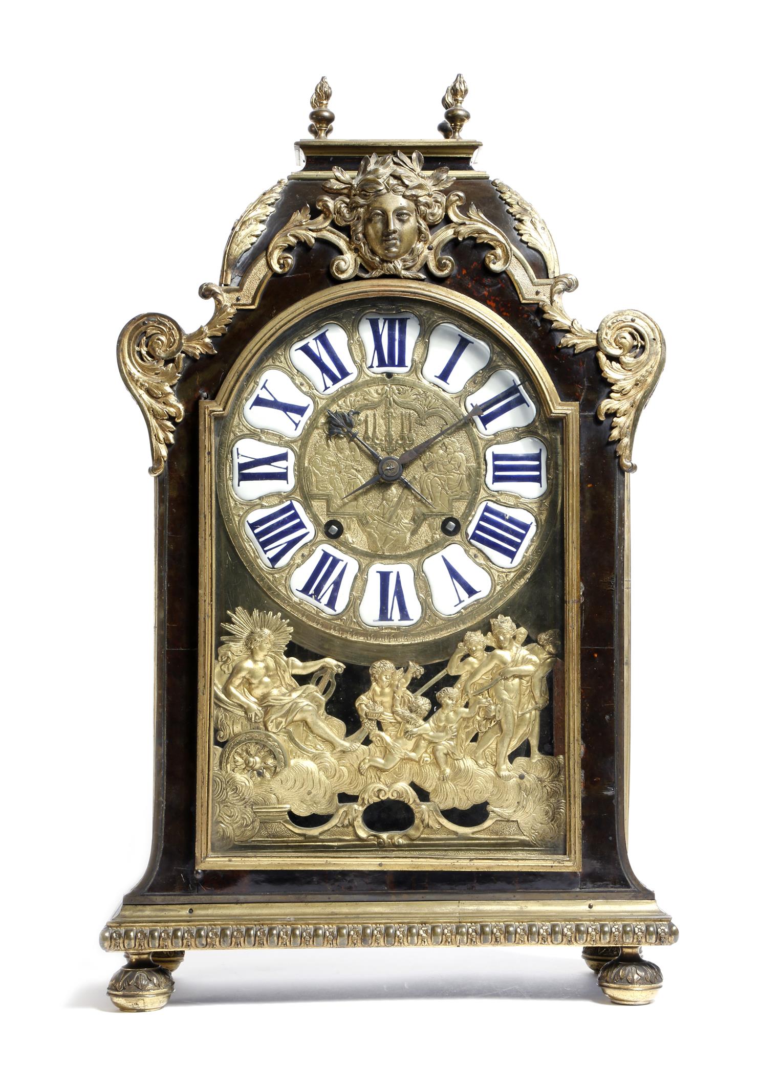 λ A French Regence tortoiseshell and ormolu mounted mantel clock by Baltazar Martinot, the brass eight day twin train movement with turned tapering pillars and an outside countwheel, striking on a bell, the backplate signed 'A PARIS, Baltazar Martinot', the brass circular dial with enamelled Roman numerals, the centre chased with musicians, above Helios, the sun god, in his chariot, the arched case with flaming finials, above a female mask and with scrolling acanthus leaf mounts, the interior with a parquetry floor and a marquetry inlaid door, 60.8cm high, 35.5cm wide.