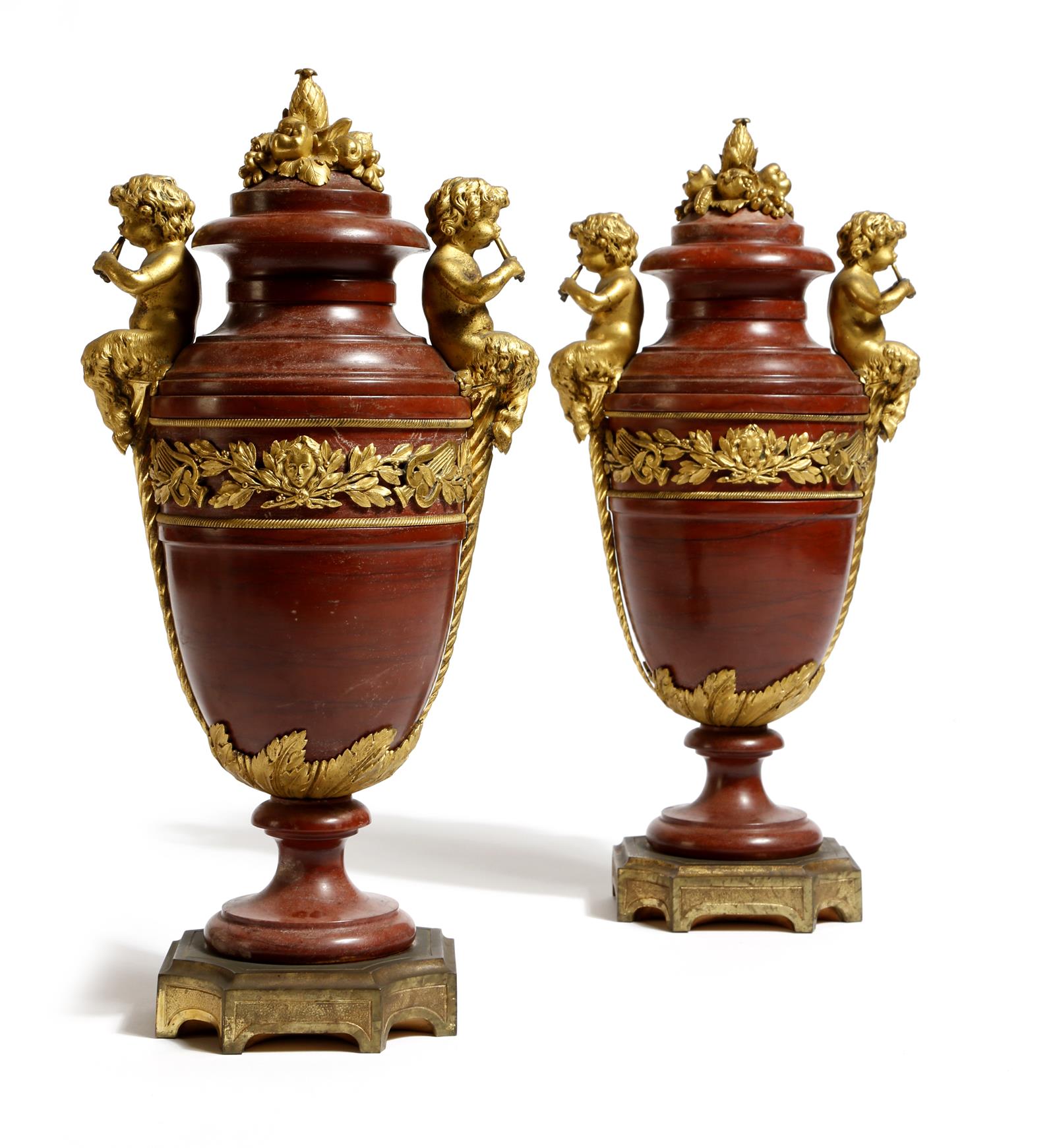 A pair of Napoleon III rosso antico marble and ormolu mounted urns in Louis XVI style, each with a fruit finial, the shoulders applied with satyr pan figures playing pipes, the turned bodies with a band of musical instruments and laurel leaves, possibly by Henri Dasson, 33.9cm high. (2)