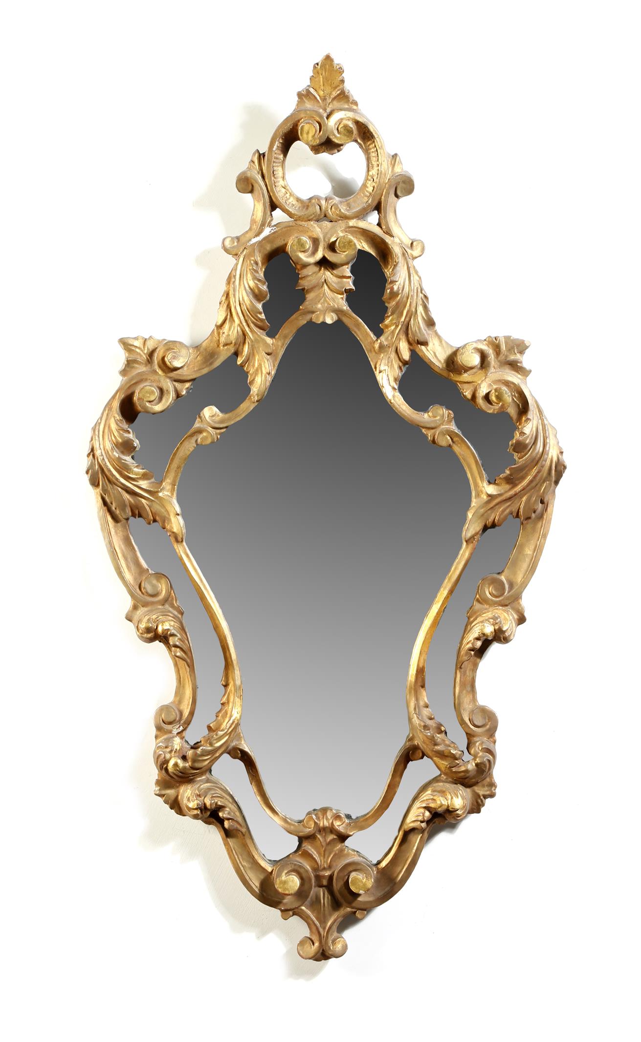 A pair of Italian giltwood wall mirrors in 18th century style, of cartouche shape, with marginal plates, the frames carved with scrolls and leaves, late 19th / early 20th century, 106 x 56.5cm. (2)
