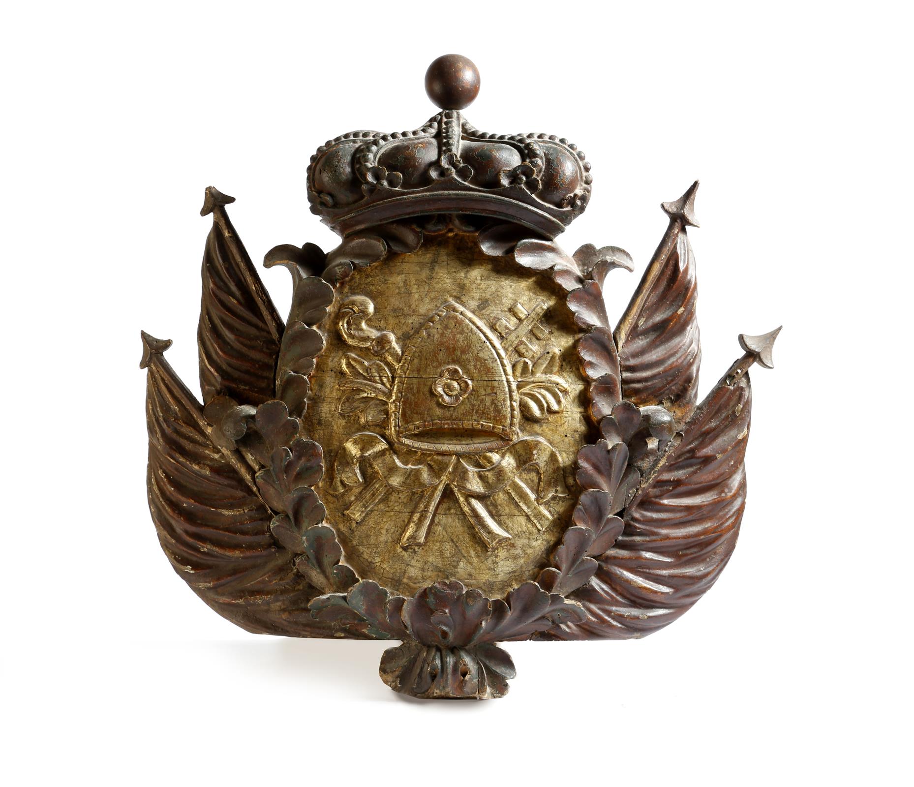 An 18th century Italian giltwood and painted coat of arms, carved with a crown, a wreath and flags with a central crest of a mitre and a crosier and a cross , 69 x 65.5cm.