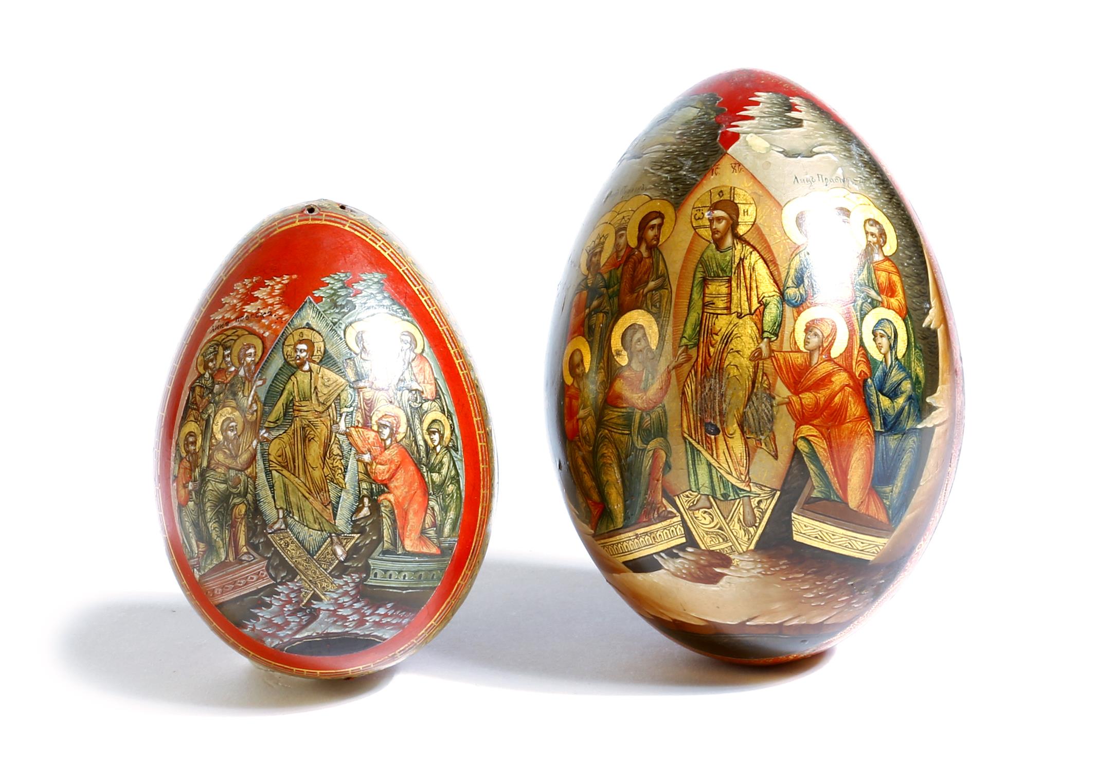 Two late 19th century Russian papier-mâché Easter eggs, both painted with Christ and his disciples, reverse of one with the angel Gabriel, both with gilt interiors and inscribed in Cyrillic and in two halves, 12.8cm high (max). (2)