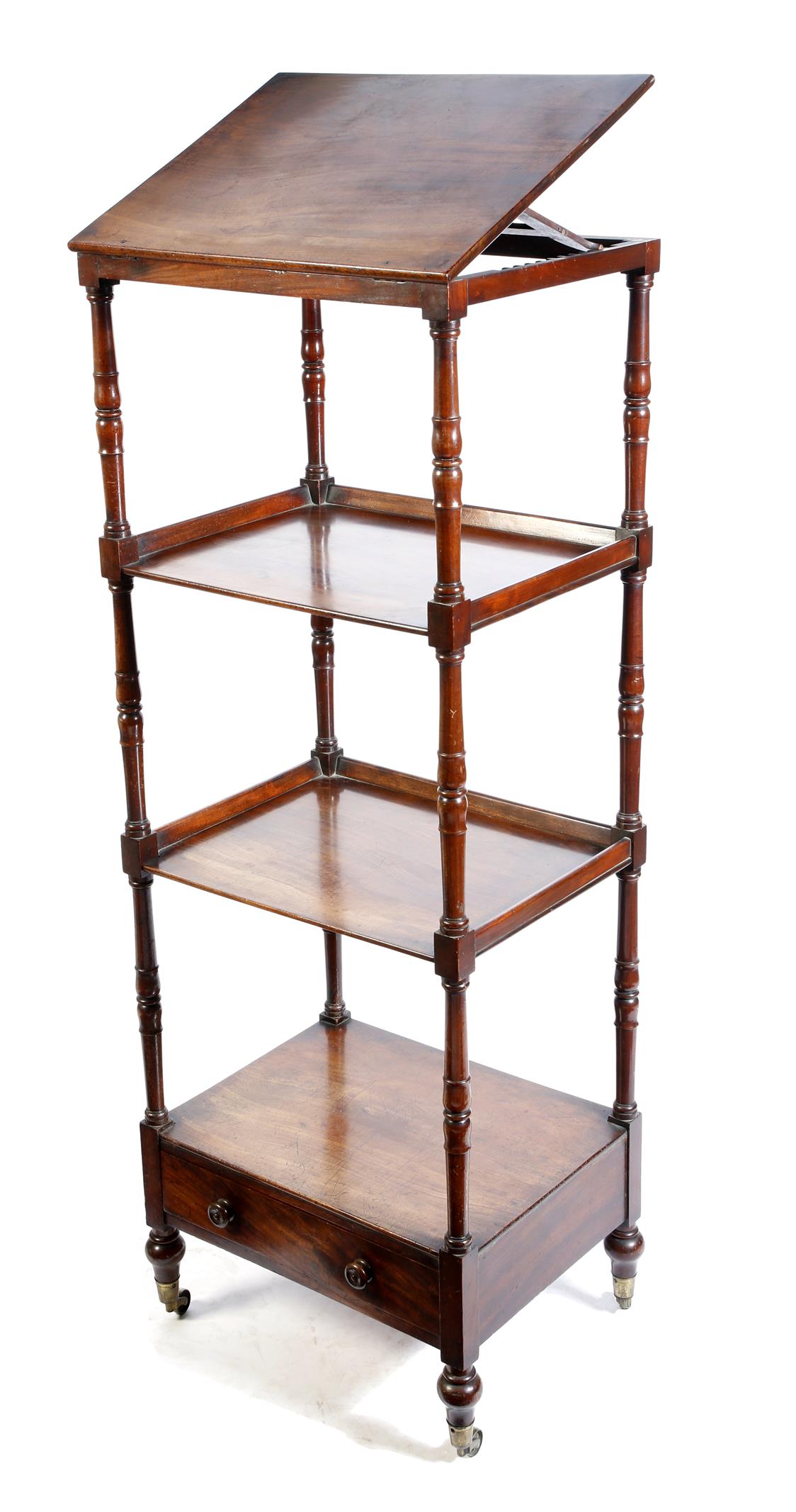 A George IV mahogany four-tier whatnot, the top hinged and on a ratchet, with lappet turned supports, the base with a drawer on brass castors, 138.2cm high, 50.7cm wide, 39.5cm deep.