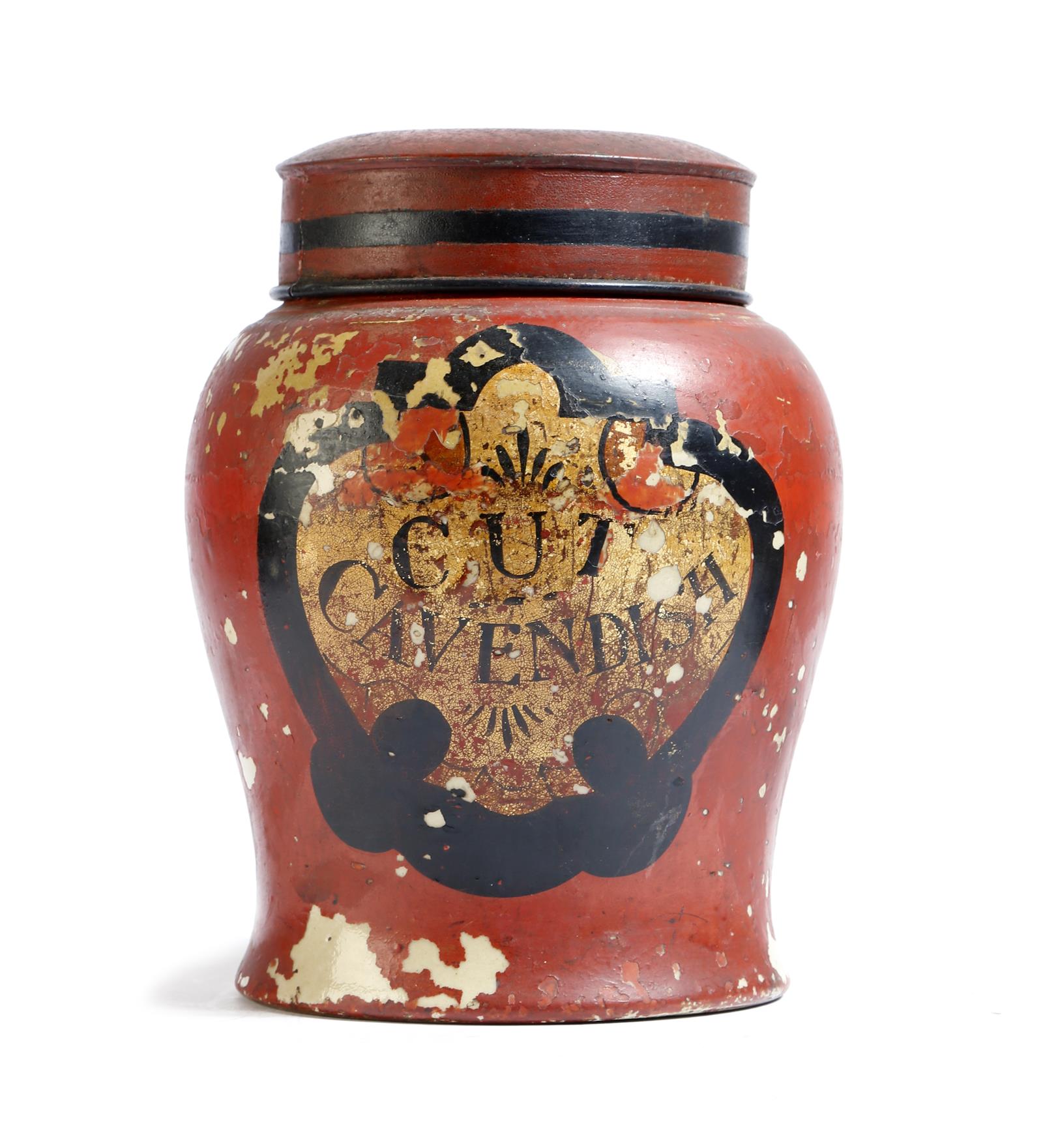 A Victorian painted pottery tobacco jar, with a tin lid, the body decorated with a cartouche, inscribed 'CUT CAVENDISH', the base with impressed marks 'H. F. & SONS, LONDON'.