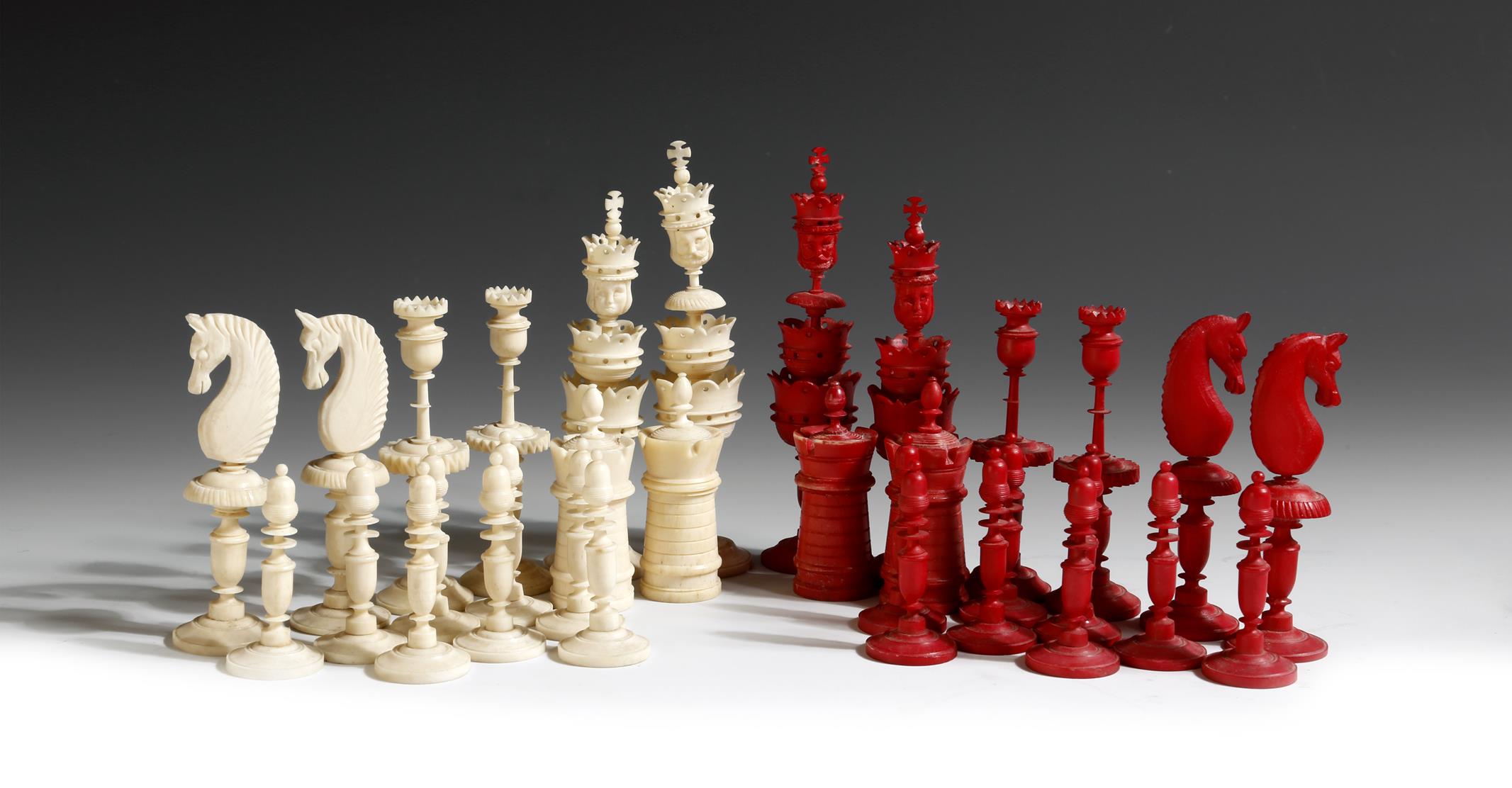 A Selenus type bone chess set, natural and stained red, the monarchs with carved busts and cross finials, German or central European, early to mid-19th century, the king: 11.9cm high, the pawn: 4.5cm high. (32)