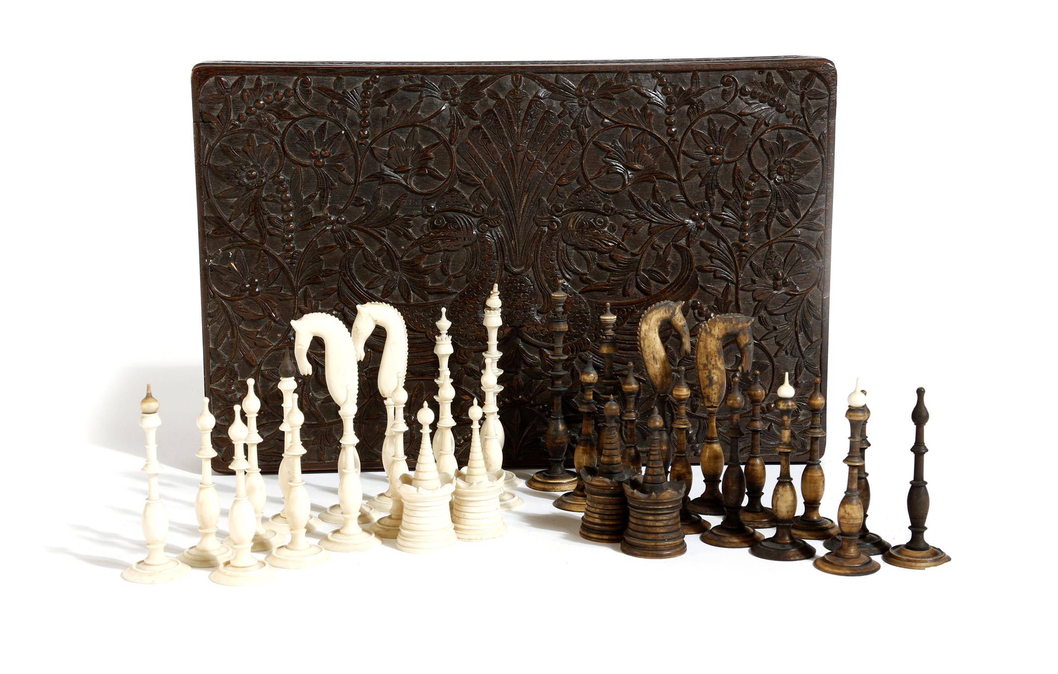 A German Selenus pattern turned bone chess set, natural and stained, the king: 8.5cm high, the pawn: 6.2cm high, early 19th century, in an Indonesian Jepara carved wood box. (33)