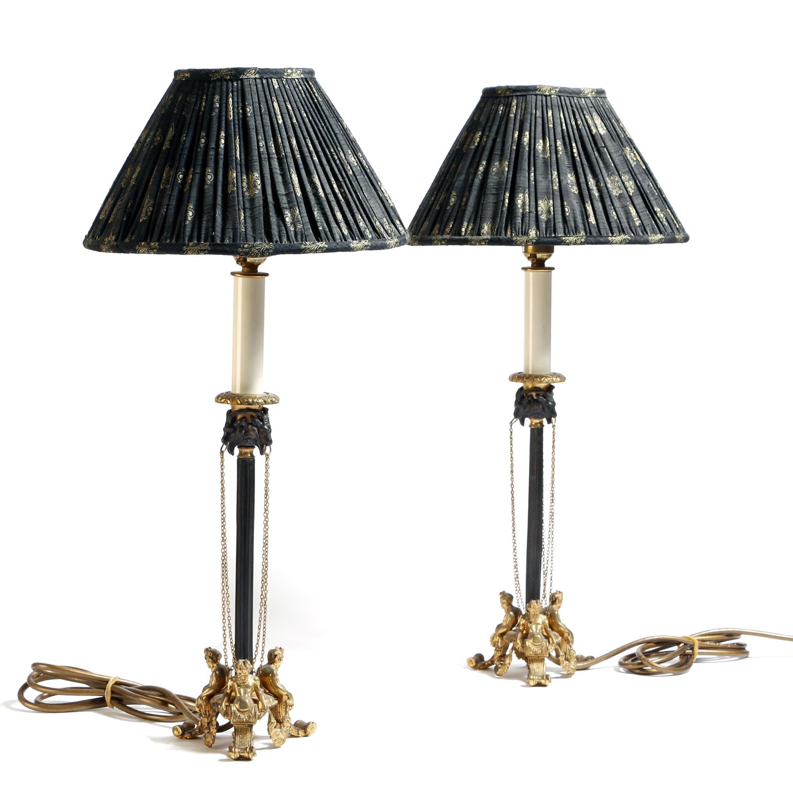 A pair of gilt and patinated bronze candlesticks in Louis XVI style, each with three ram's head masks issuing chains, the base with satyr monopodia holding swags of flowers, 28.3cm high (excluding fittings), later converted into table lamps, with silk shades. (2)