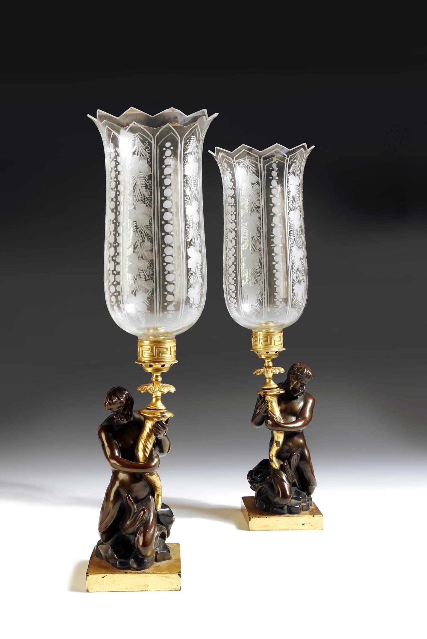A pair of early 19th century patinated and gilt pottery, glass and brass storm lanterns, each modelled with a figure of Triton holding a cornucopia, after a Wedgwood design of a basalt candlestick, supporting an urn, decorated with a Greek key border and with an etched glass shade, 53.7cm high. (2)