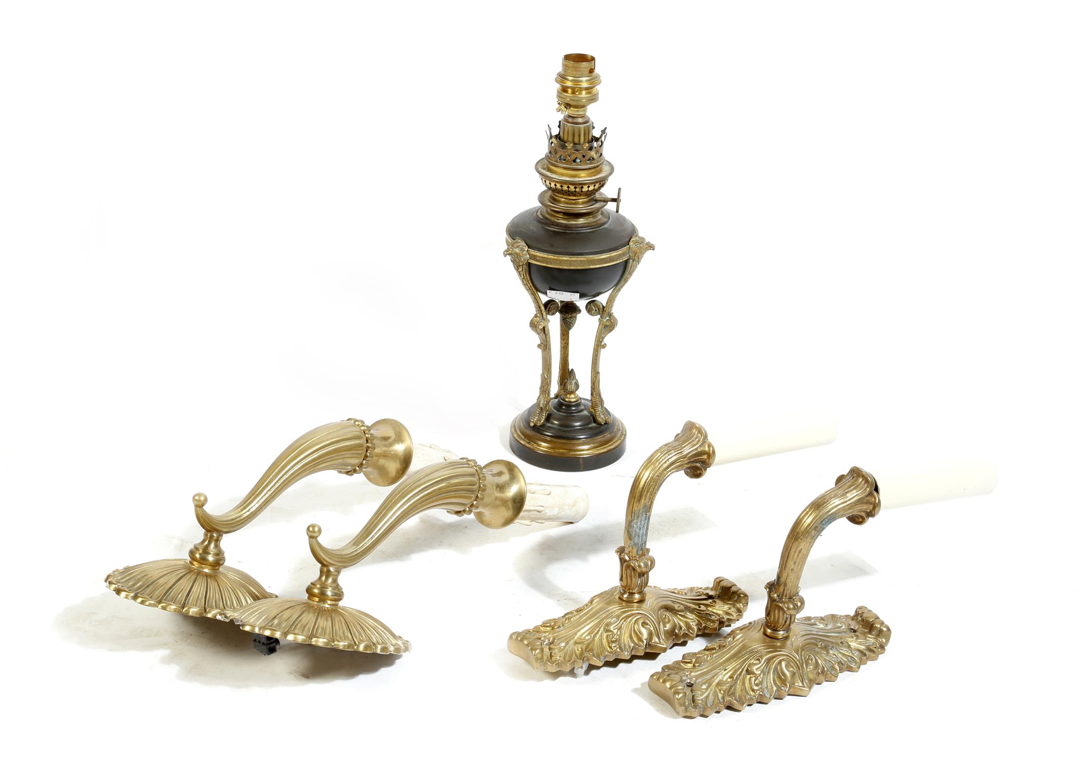 Two pairs of brass wall lights, one with a shell backplate, the other with scrolling foliage, with faux candle sconces, together with a Louis XVI style table lamp, 30.5cm high (max). (5)