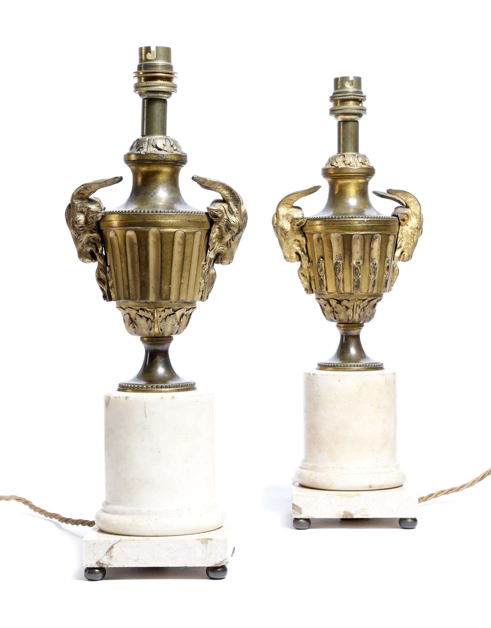 A pair of Neo-classical ormolu urns, each with a stop fluted body and ram's head masks, on a turned marble plinth, later converted into table lamps, 38.5cm high. (2)