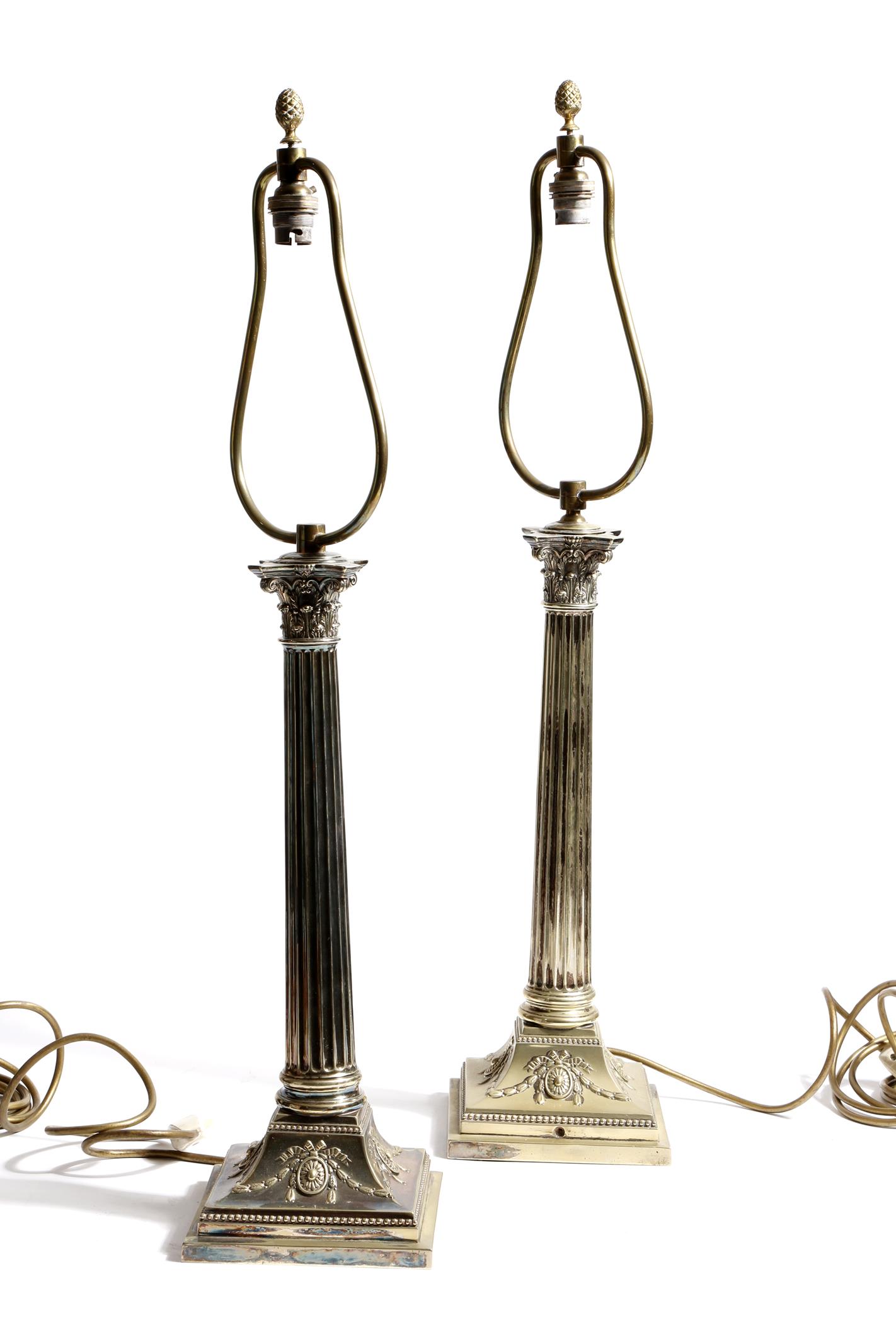 A pair of Edwardian silver plated Corinthian column table lamps, each with a fluted stem, above a base decorated with paterae and ribbon tied husks, 42.8cm high, excluding fittings. (2)