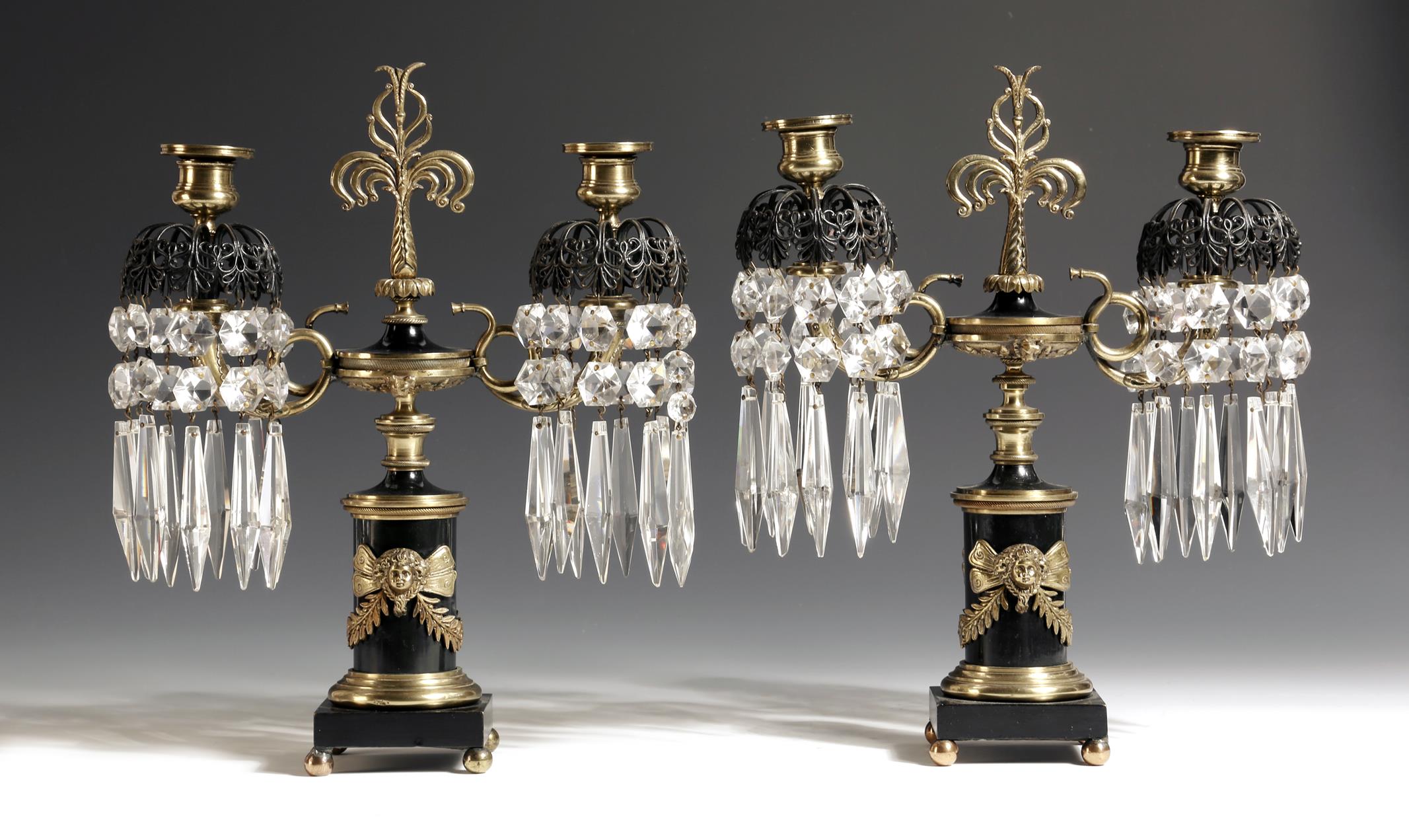 A pair of 19th century patinated bronze and brass twin-light lustre candlesticks