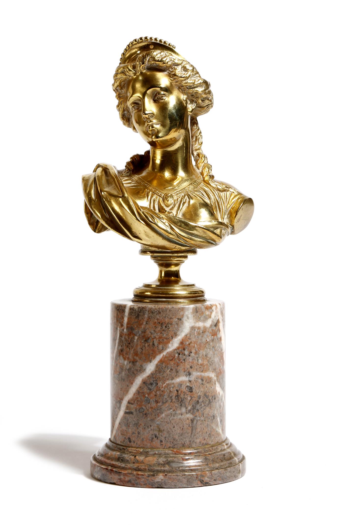 After Albert-Ernest Carrier-Belleuse (French 1824-1887). A polished bronze bust of a lady, signed 'A Carrier', on a marble socle, 26.4cm high.