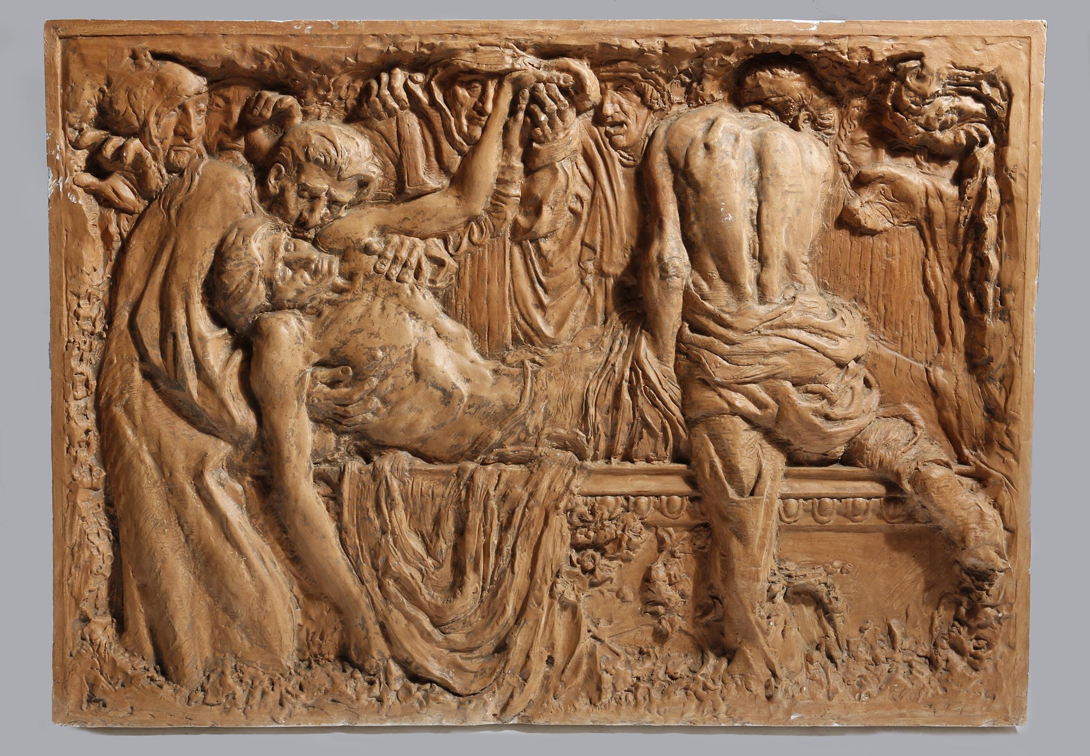 Sir Frank Brangwyn (1867-1956). A large early 20th century plaster cast relief of the Entombment of Christ, with a terracotta painted finish, 85.3 x 119cm.