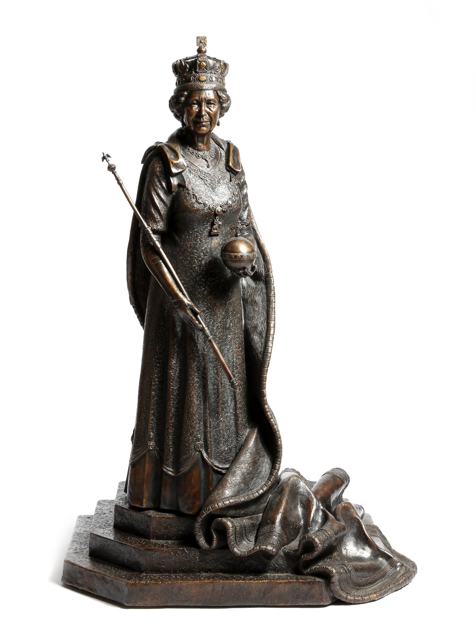 A modern bronze figure of Queen Elizabeth II, holding the orb and septre and dressed in ceremonial robes, wearing her crown, standing on a stepped plinth, the base stamped DF1/10, 71.1cm high, 45.2cm wide.