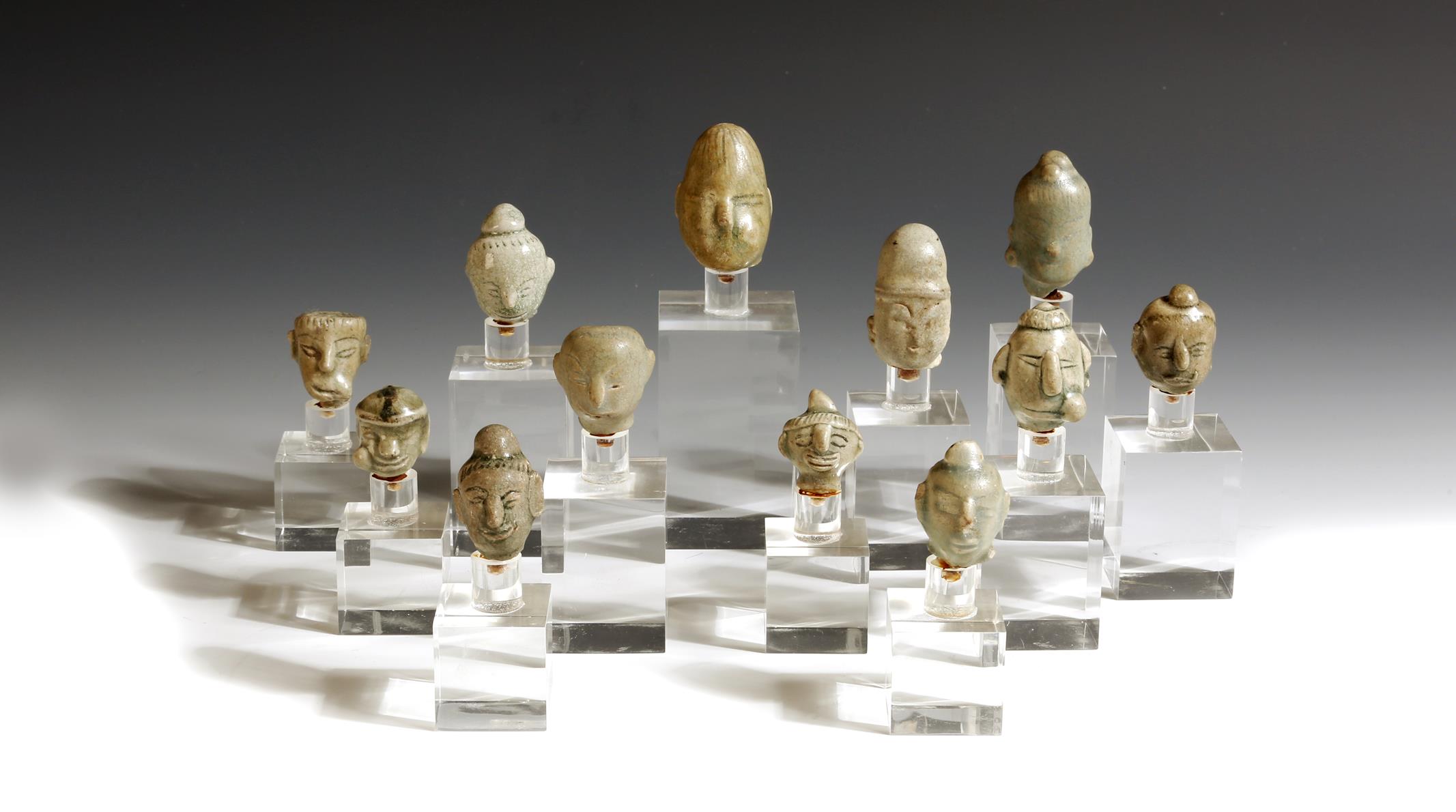 Twelve Thai celadon glazed pottery medicine heads, each mounted on a Perspex plinth and in a Perspex case, 5cm high (max). (13)