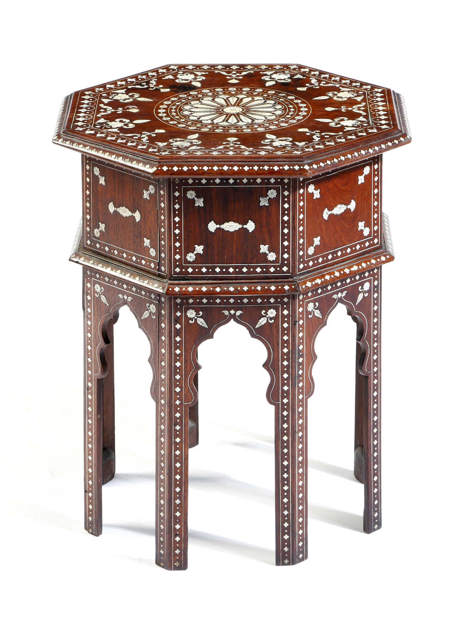 λ An Anglo-Indian rosewood octagonal occasional table attributed to M. Yusuf Ali & Sons, ivory inlaid with flowers and foliage, the top with a rosette, with mihrab arch legs, early 20th century, 46.8cm high, 40.8cm wide.