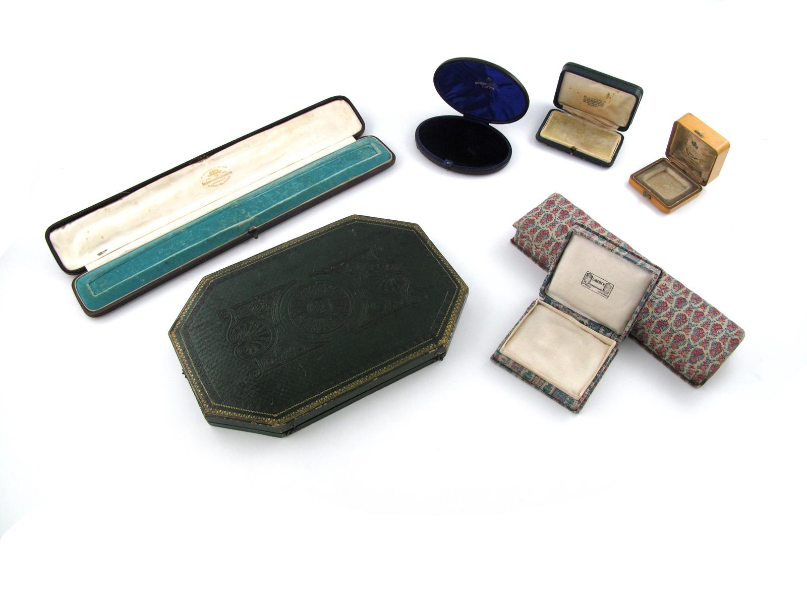 Seven assorted jewellery boxes, including an early 19th century green leather button box with elaborate blind-stamped decoration to the hinged cover within gold acanthus border, 26cm wide, a square hollywood box with dilapidated silk lining to the hinged cover stamped for Fabergé, a rectangular fabric box with cover for Liberty, 23cm wide, a square fabric covered box for Liberty, 9cm wide, a green leather case for Boucheron, a domed oval-shaped box for Hunt and Roskell and a long jewellery case for the Goldsmiths and Silversmiths Company, 36cm wide