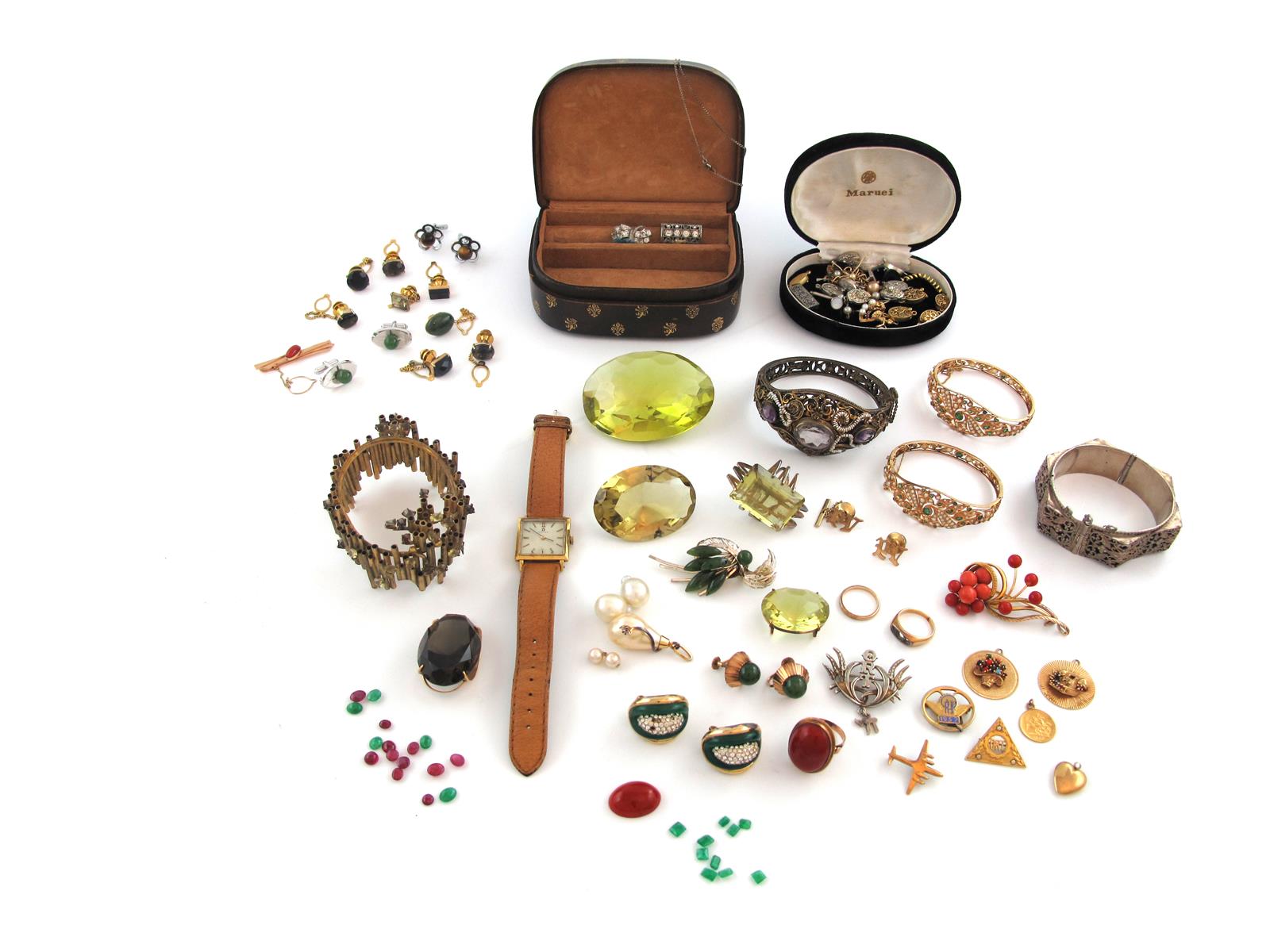 A large quantity of jewellery and costume jewellery including two gold bangles, a smoky quartz gold pendant, a selection of gold clasps, a collection of loose emerald and ruby cabochons, a coral-mounted gold brooch, a coral ring, a pair of nephrite gold earrings and various other items of jewellery and costume jewellery
