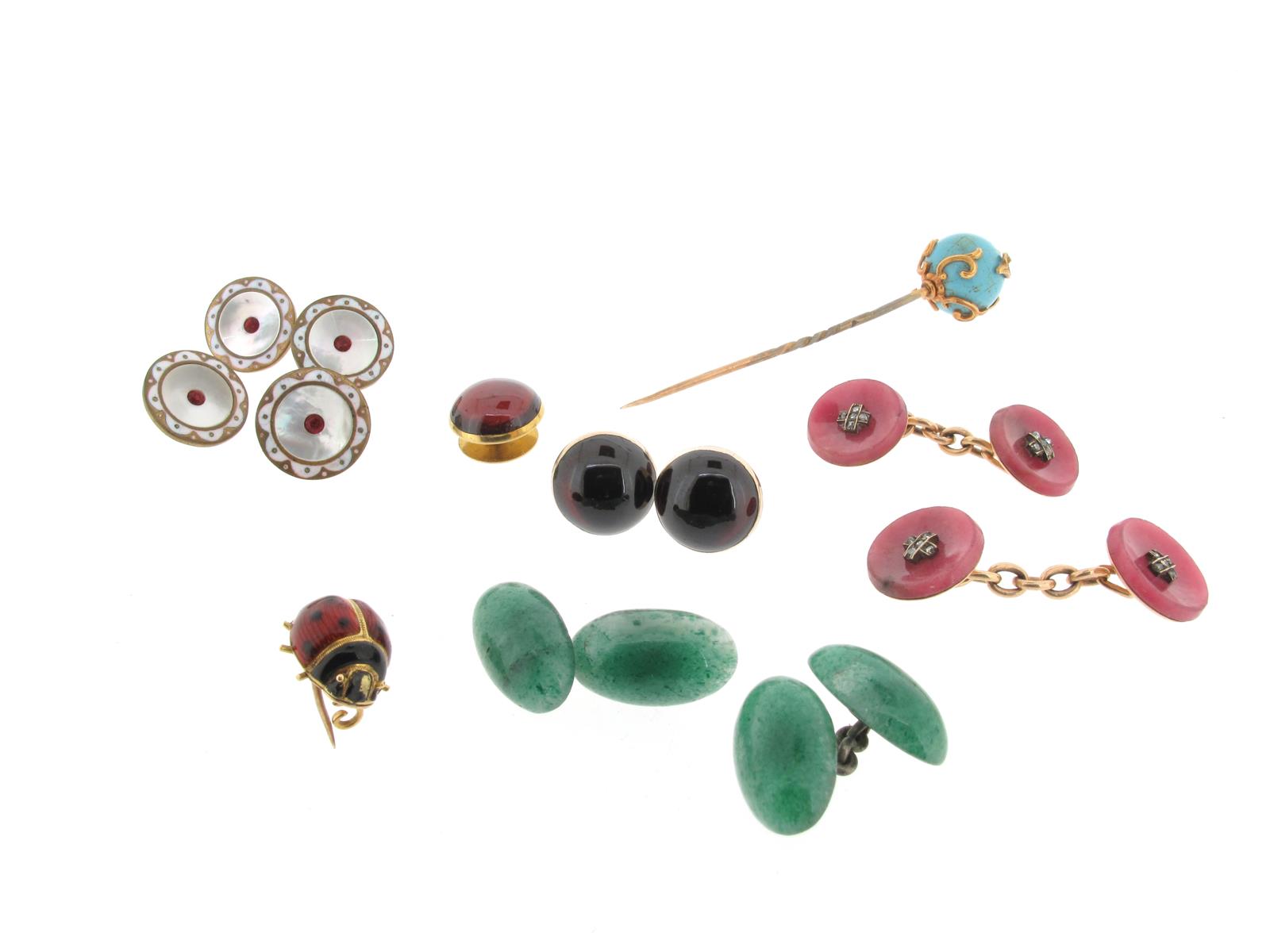 A mixed lot of jewellery including a pair of Rhodonite disc cufflinks, each circular section centred with a cross of rose-cut diamonds, a gold-mounted turquoise-coloured bead stick pin, a pair of green-stone cufflinks, a gold ladybird brooch with black and red enamel decoration, 1.3cm long, and a pair of cabochon circular garnet-mounted gold earrings with matching stud